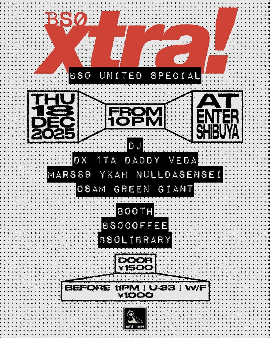 多様なバックボーンを持ったDJたちが、ダブ、ダブステップ、グライム、ジャングル、ブレイクビーツ、テクノなどのスタイルを“現代のパンク”と捉えて一夜に落とし込む、BS0xtra(ビー・エス・ゼロ・エクストラ)。 2025年の最後となる今回は、11月に6年ぶりにナンバーシリーズとなる BS00RS を開催し、今年10周年を迎えたBS0から、Dx、1TAを迎えての忘年会スペシャル!