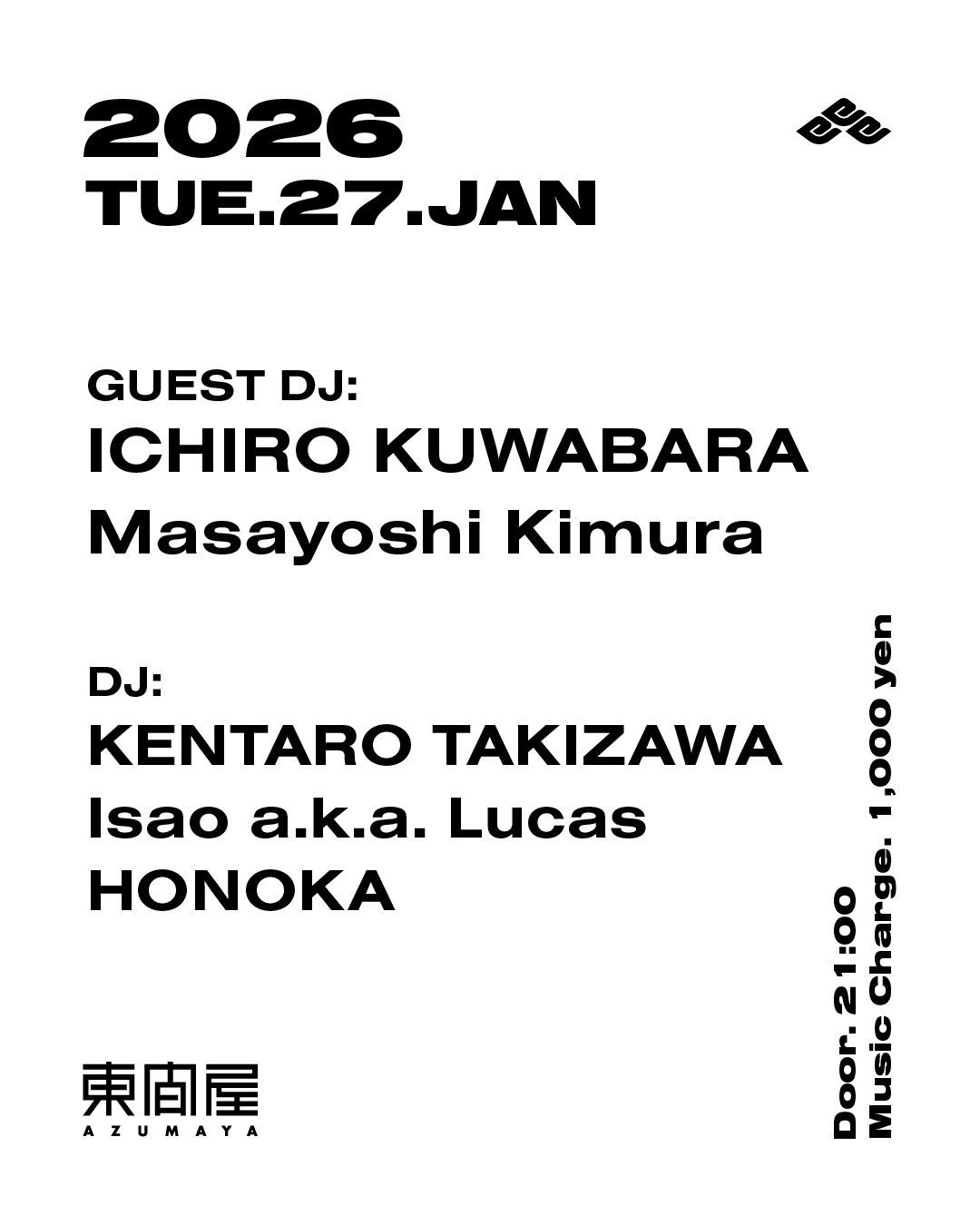 2026.01 27 TUE Azumaya -Tuesday- iFLYER: 358351 ALLMIX Facebook Twitter DATE: 2026-01-27 TUE OPEN: 21:00 VENUE: AZUMAYA PRICE: Music Charge 1,000yen LINE UP: GUEST DJ ICHIRO KUWABARA Masayoshi Kimura DJ KENTARO TAKIZAWA Isao a.k.a. Lucas HONOKA Facebook Twitter