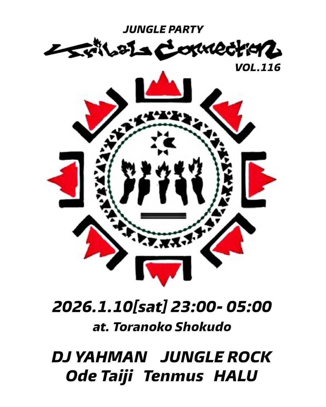 2009年に始動したTribal Connectionは、現在、DJ YAHMAN、JUNGLE ROCK、大出泰士、Tenmus、HALUの5人で構成。各自のバックグラウンドを軸に多角的なジャングル活動を行い、同名のJUNGLE PARTYを渋谷の虎子食堂にて開催中。2023年11月にパーティー通算100回目/創立14周年祭を開催。2024年、創立15周年。そして、2025年12月に創立16周年祭を開催。