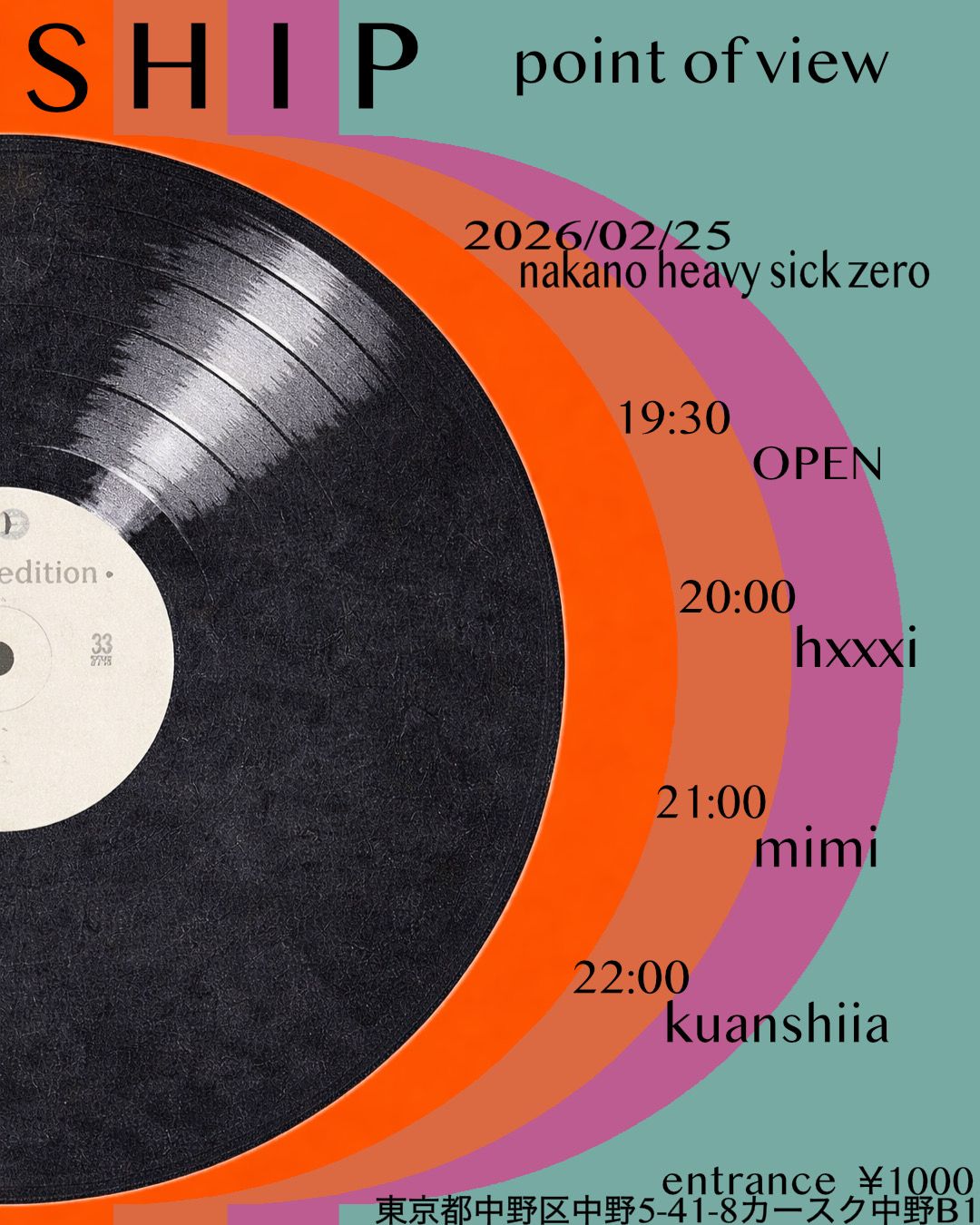 2026.02 25 WED SHIP ~point of view~ REGGAE DUB BASS MUSIC HOUSE OTHER Facebook Twitter DATE: 2026-02-25 WED OPEN: 19:30 VENUE: heavy sick ZERO PRICE: DOOR 1000YEN LINE UP: ■DJ hxxxi mimi kuanshiia □heavysick ZERO Instagram https://www.instagram.com/heavysickzero/ Facebook Twitter