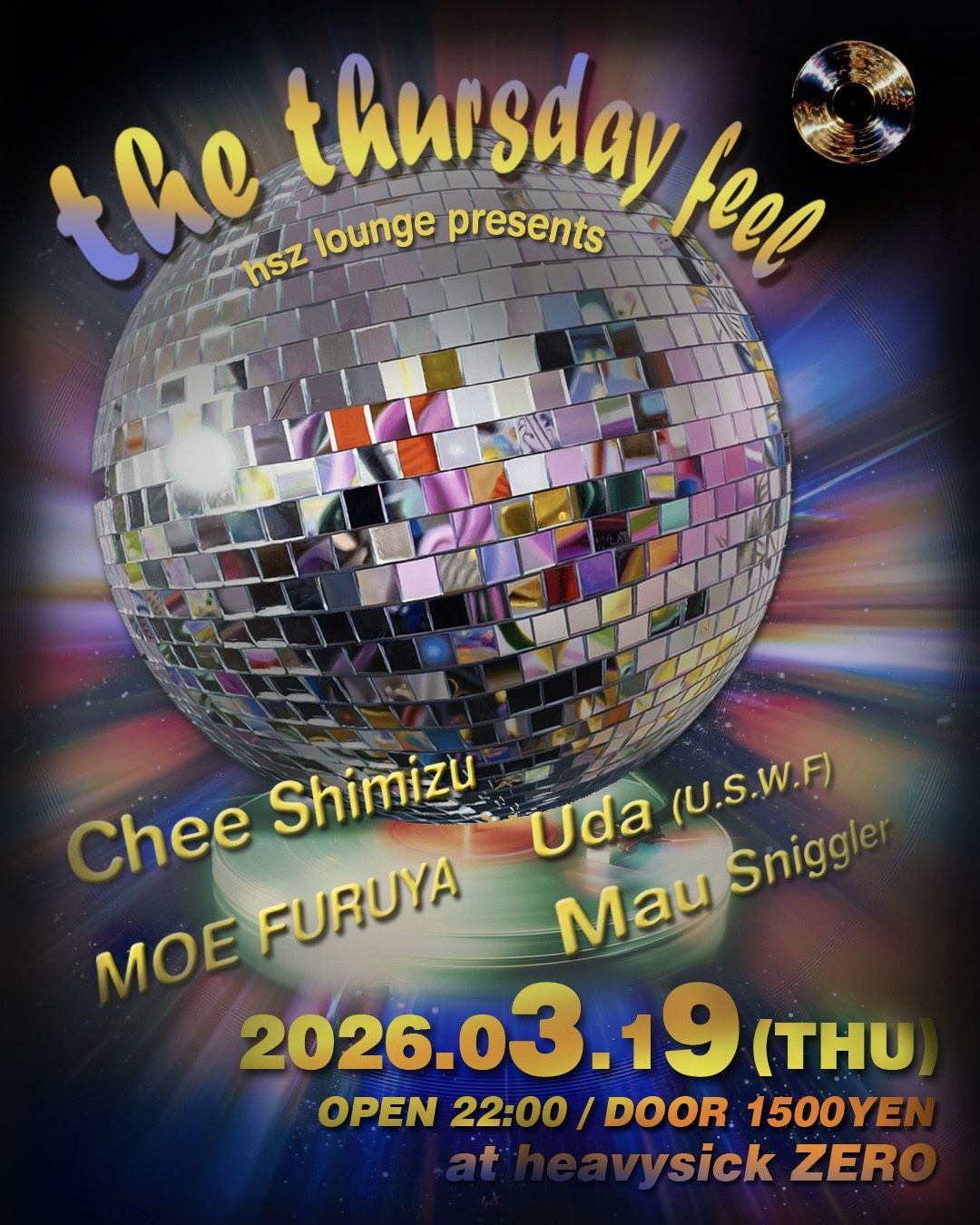 2026.03 19 THU the thursday feel DISCO HOUSE JAZZ RARE GROOVE CROSSOVER Facebook Twitter DATE: 2026-03-19 THU OPEN: 22:00 VENUE: heavy sick ZERO PRICE: DOOR:1500YEN LINE UP: ■DJ Chee Shimizu Uda (U.S.W.F) MOE FURUYA Mau Sniggler □heavysick ZERO Instagram https://www.instagram.com/heavysickzero/ Facebook Twitter