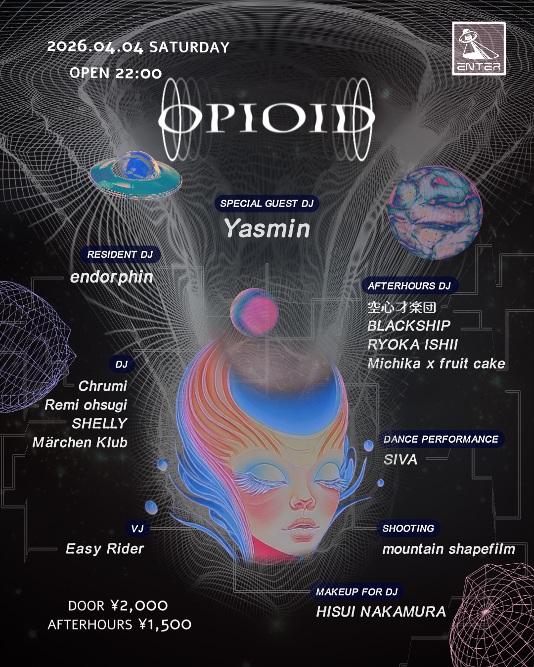 着実にその存在感を示し頭角を表す気鋭のフィメールDJ endorphin がダンスフロアに鎮痛と多幸をもたらす実験をコンセプトに、これまでMari Sakurai、KOPYなど国内アーティストに留まらず台湾からゲストMiranda kuを誘致するなど勢力的に開催して来たパーティ OPIOID が遂に新世代東京カルチャーの震源地ENTERの週末枠に移動し2回目の開催!