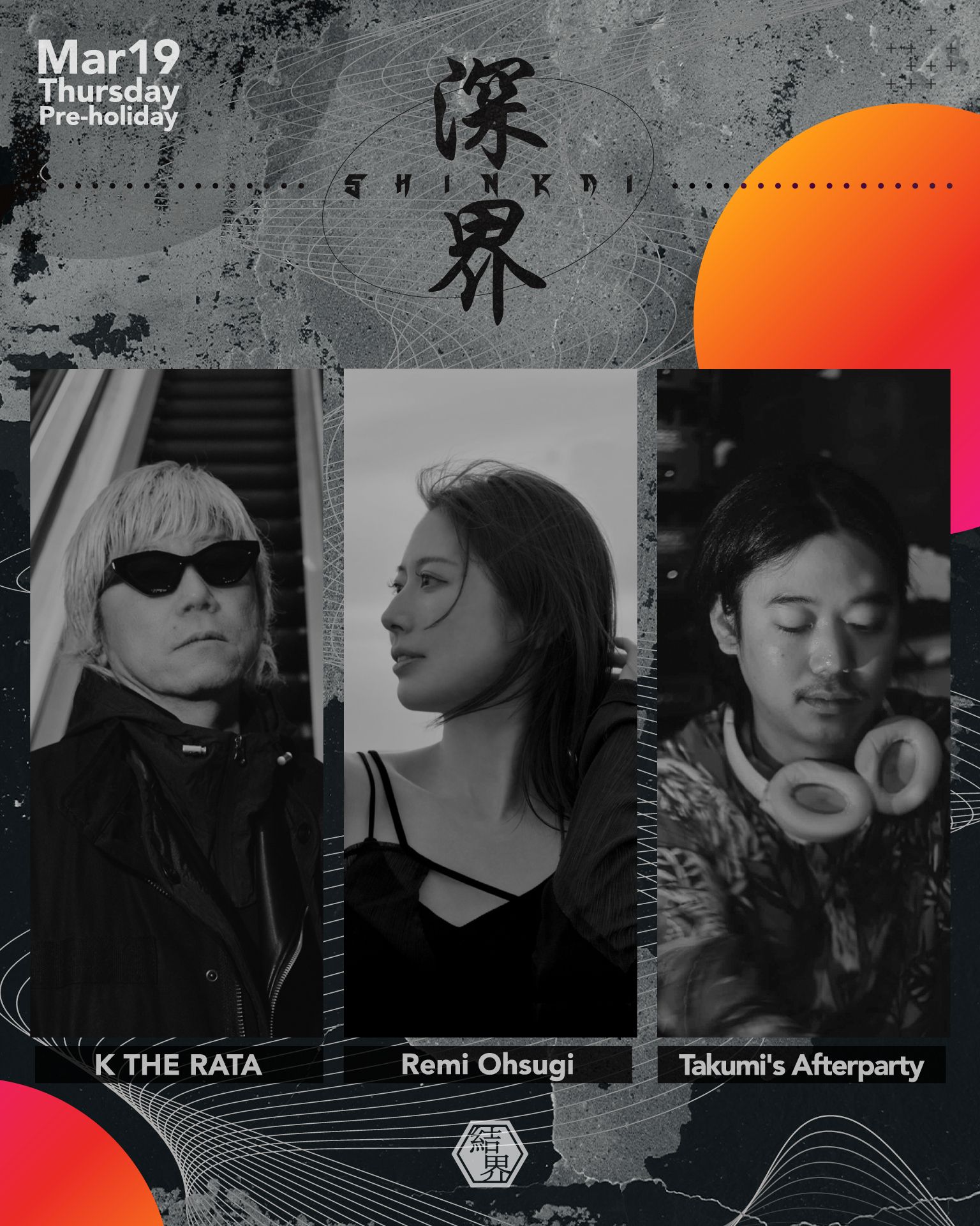 2026.03 19 THU 深界 - s h i n k a i - TECHNO Facebook Twitter DATE: 2026-03-19 THU OPEN: 22:00 VENUE: 結界 PRICE: ¥1500 / inc 1D LINE UP: K THE RATA Remi Ohsugi Takumi's Afterparty 深界 深界 深界 深界 深界 Facebook Twitter