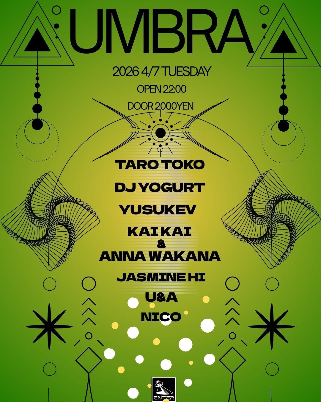 国内外で活躍する選りすぐりのアーティストたち — Taro Toko、DJ YOGURT、YUSUKEV、KAIKAI & ANNA WAKANA、JASMINE HI、U&A、NICO — が、それぞれの感性でダンスフロアに弾みをつける。