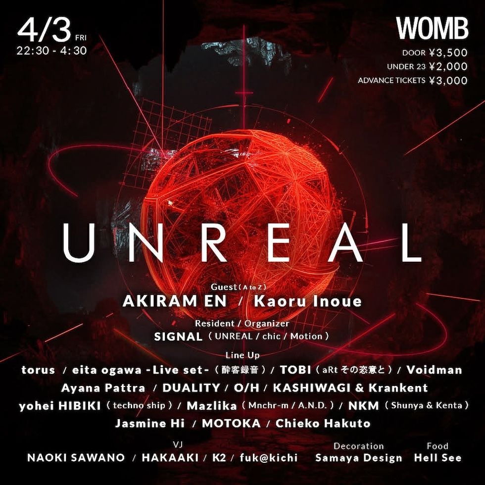 2026年、全ての音楽好きパーティーピープルに捧ぐパーティー UNREAL。 2021年、2022年と2年連続、野外開催(おおばキャンプ村)で200人以上の動員を記録。2021年から WOMB で開催され毎回盛り上がりを見せ前回2026年1月では、500人以上の動員数を記録。今回開催となるスペシャルな一夜を彩るべく、ゲストには、世界中のディガーやドープなパーティーヘッズからの信頼は深く、rural 、Future Terror、MNML SSG と言った、日本を代表する野外フェス、テクノパーティーに出演している AKIRAM EN。リミックスを国内外のレーベルで手がけ、大小問わずクラブ、屋外レイヴ・パーティー、またその他様々な場で DJ として活動を続け、House〜Techno を軸とした DJ セット、音楽制作を続けてきたが、近年はダンス・ミュージックに限らず Jazz、Ambient、Balearic、Experimental など様々な音楽を独自の審美眼で繋いでいく DJ スタイルや、環境音楽的、第四世界的な楽曲制作が新たに好評を博している Kaoru Inoue を迎える。