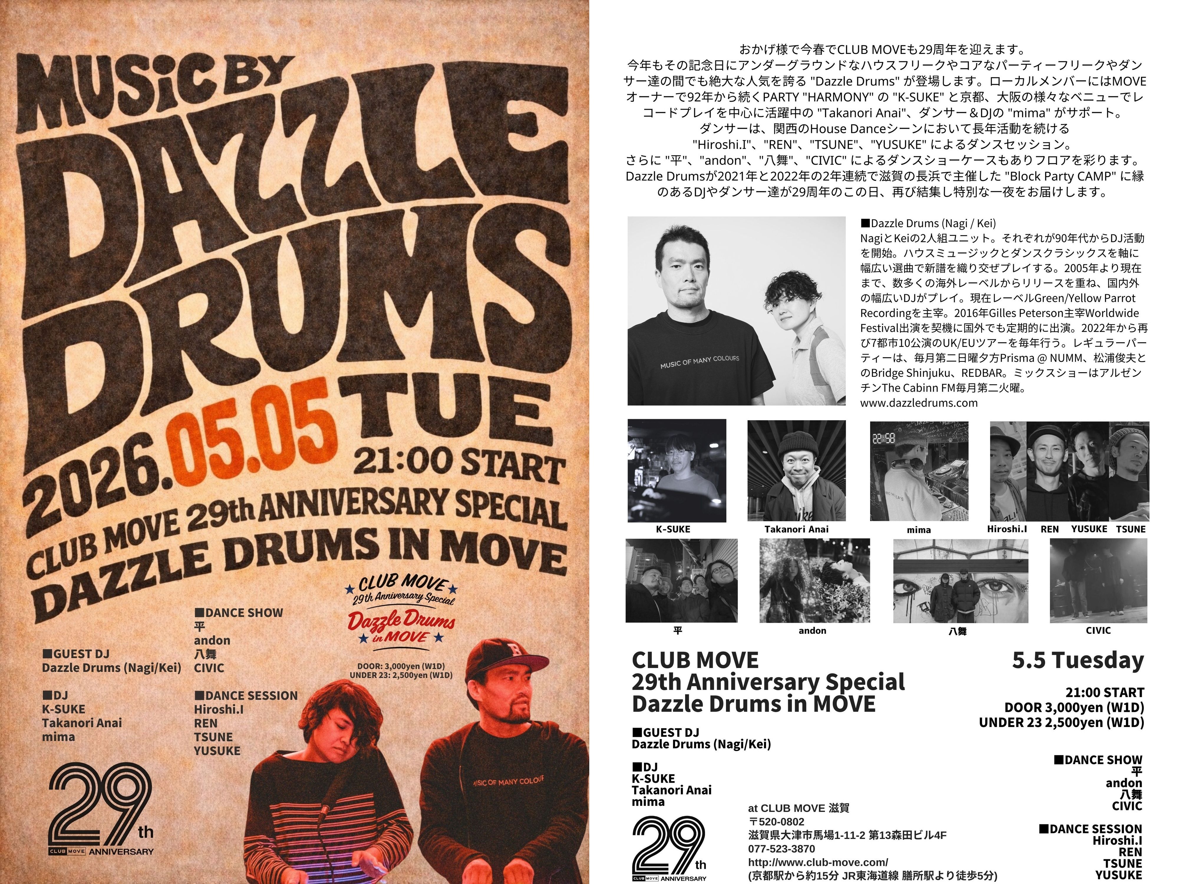 On this commemorative day, the immensely popular 'Dazzle Drums,' beloved among underground house enthusiasts, core party freaks, and dancers, will appear. Local members supporting them include MOVE owner 'K-SUKE,' host of the 'HARMONY' party since 1992, 'Takanori Anai,' active mainly as a record player at various venues in Kyoto and Osaka, and dancer & DJ 'mima.' Dancers will include a dance session by 'Hiroshi.I,' 'REN,' 'TSUNE,' and 'YUSUKE,' who have long been active in the Kansai House Dance scene. Additionally, there will be dance showcases by 'Taira,' 'andon,' 'Yamai,' and 'CIVIC,' adding color to the floor.