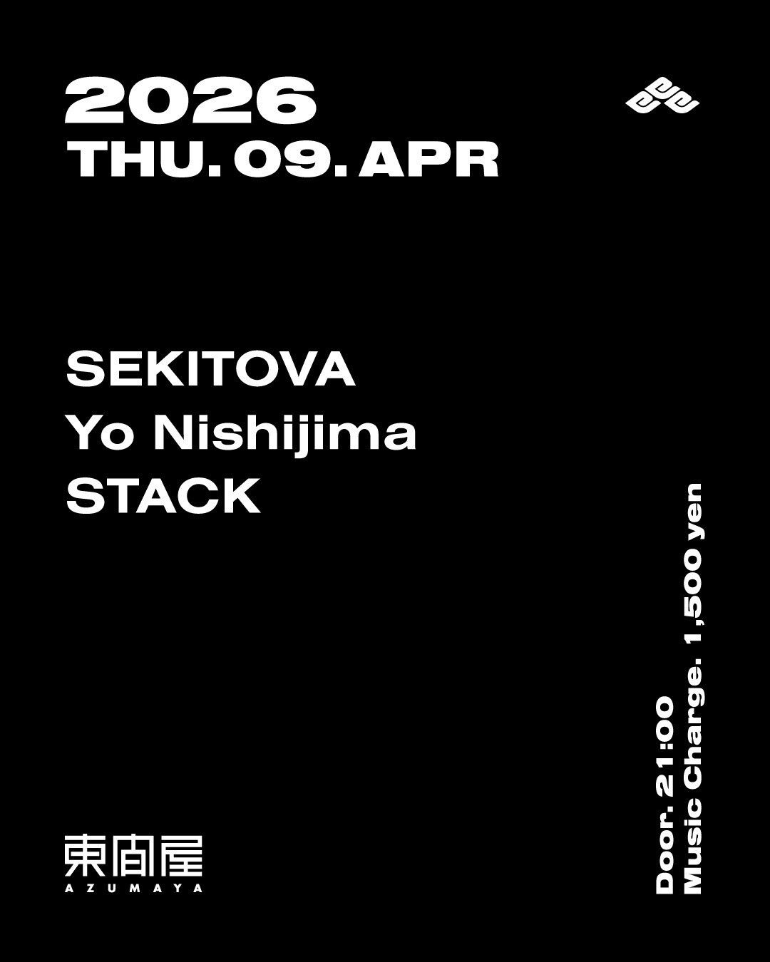 2026.04 09 THU Azumaya -Thursday- iFLYER: 359250 HOUSE TECHNO Facebook Twitter DATE: 2026-04-09 THU OPEN: 21:00 VENUE: AZUMAYA PRICE: Music Charge 1,500yen LINE UP: SEKITOVA Yo Nishijima STACK Facebook Twitter