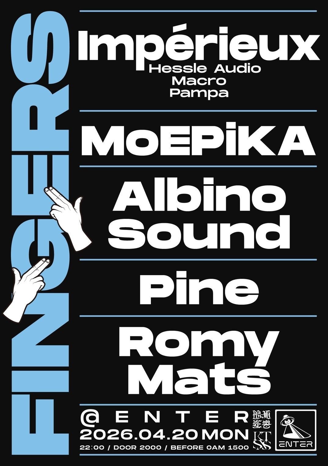 Romy MatsとAlbino SoundsによるFingersが、〈Hessle Audio〉や〈Pampa〉、〈Macro〉等の著名レーベルからリリースを重ね、Ben UFOやDixon、Caribouらからも支持を受けるDJ/プロデューサーのImpérieuxを招聘。ローカルからはMoEPiKAと〈Hekdb〉のファウンダーPineがラインナップ。