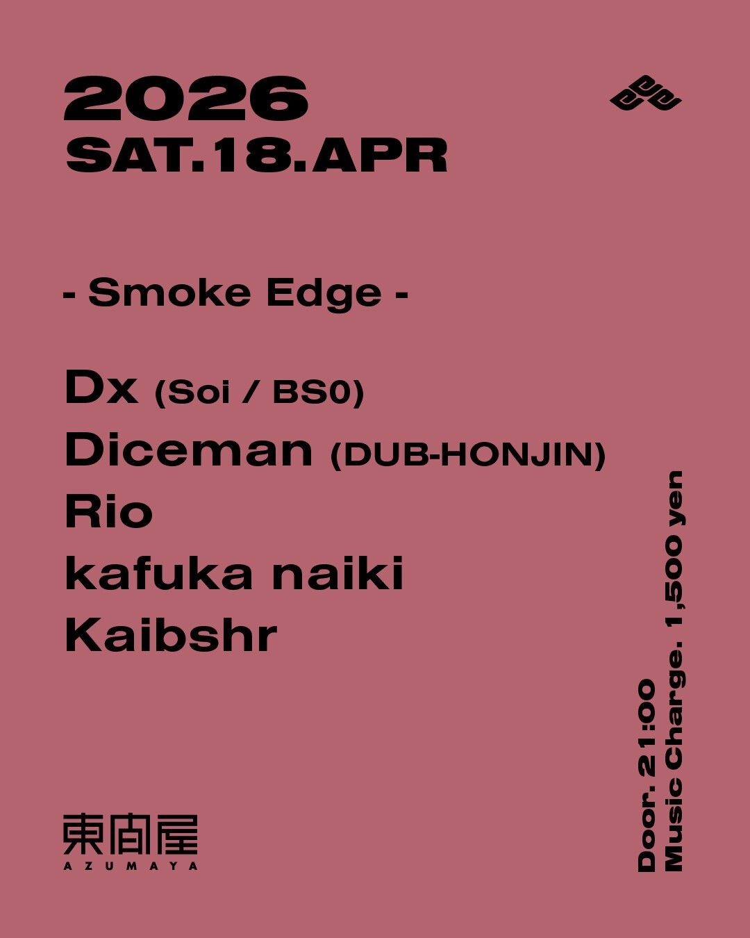 2026.04 18 SAT Smoke Edge iFLYER: 359266 DUB BASS MUSIC Jungle Facebook Twitter DATE: 2026-04-18 SAT OPEN: 21:00 VENUE: AZUMAYA PRICE: Music Charge 1,500yen LINE UP: Dx (Soi / BS0) Diceman (DUB-HONJIN) Rio kafuka naiki Kaibshr Facebook Twitter