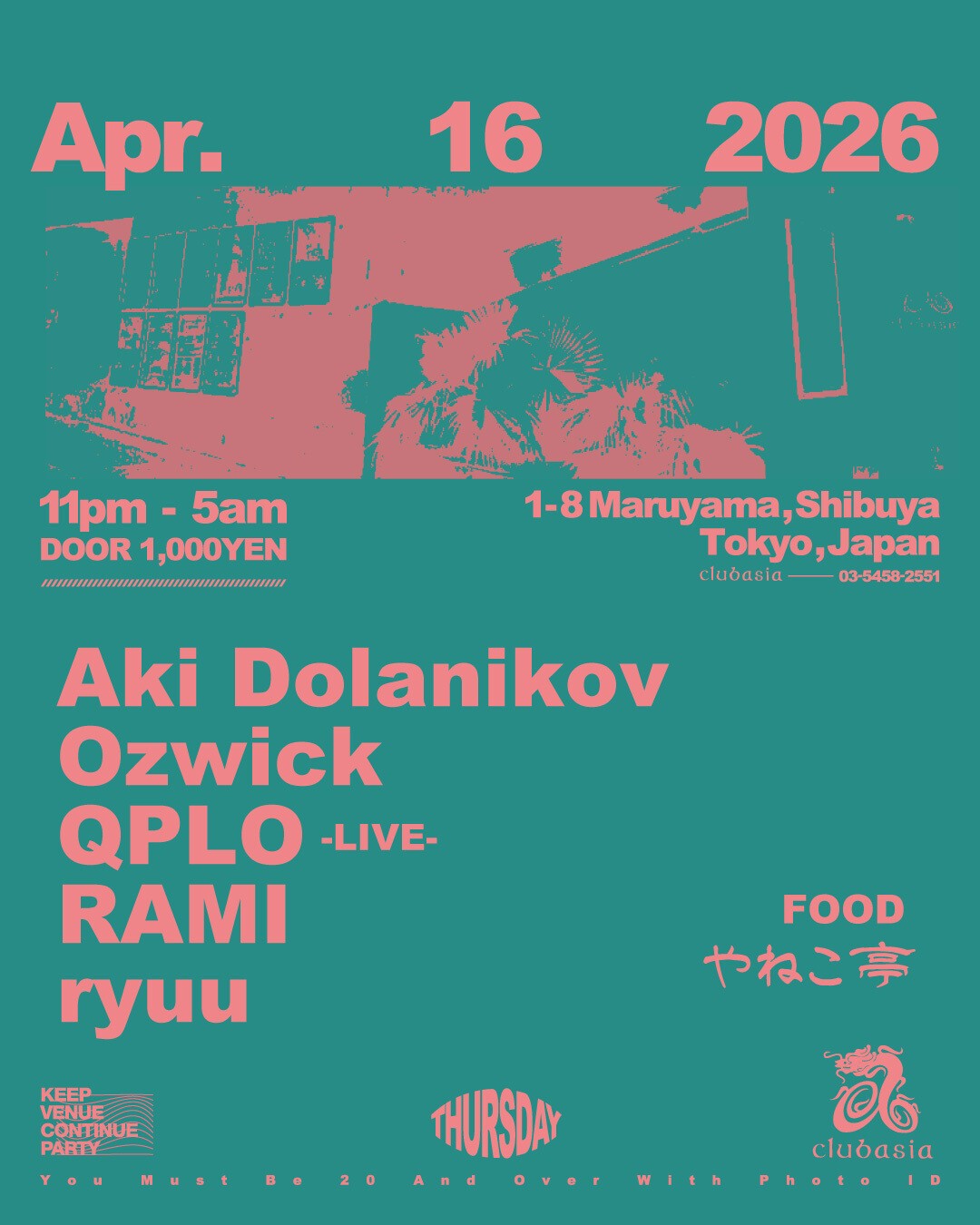2026.04 16 THU club asia THURSDAY iFLYER: 359278 HOUSE DISCO TECH HOUSE Facebook Twitter DATE: 2026-04-16 THU OPEN: 23:00 VENUE: clubasia PRICE: 1,000yen LINE UP: 026.4.16_THU " Facebook Twitter