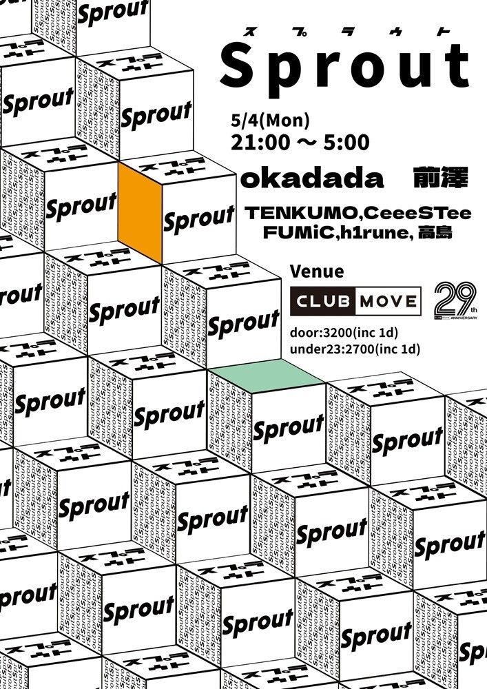 Sprout is an event centered on four-on-the-floor beats by Takashima, where various genres such as techno, house, nardcore, and Showa-era pop are played, aimed at promoting the sprouting and growth of new DJs. Please feel free to use it as a place to meet friends who can stimulate each other's growth and discover new talent.
