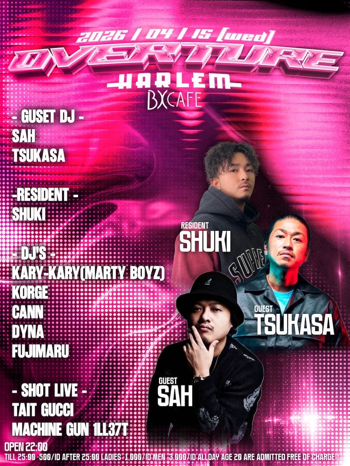 - LADIES ¥1,000/1d MEN ¥3,000/1d ※ TILL 25:00 ¥500/1d ※ AGE 20 ARE ADMITTED FREE OF CHARGE ALL DAY!!