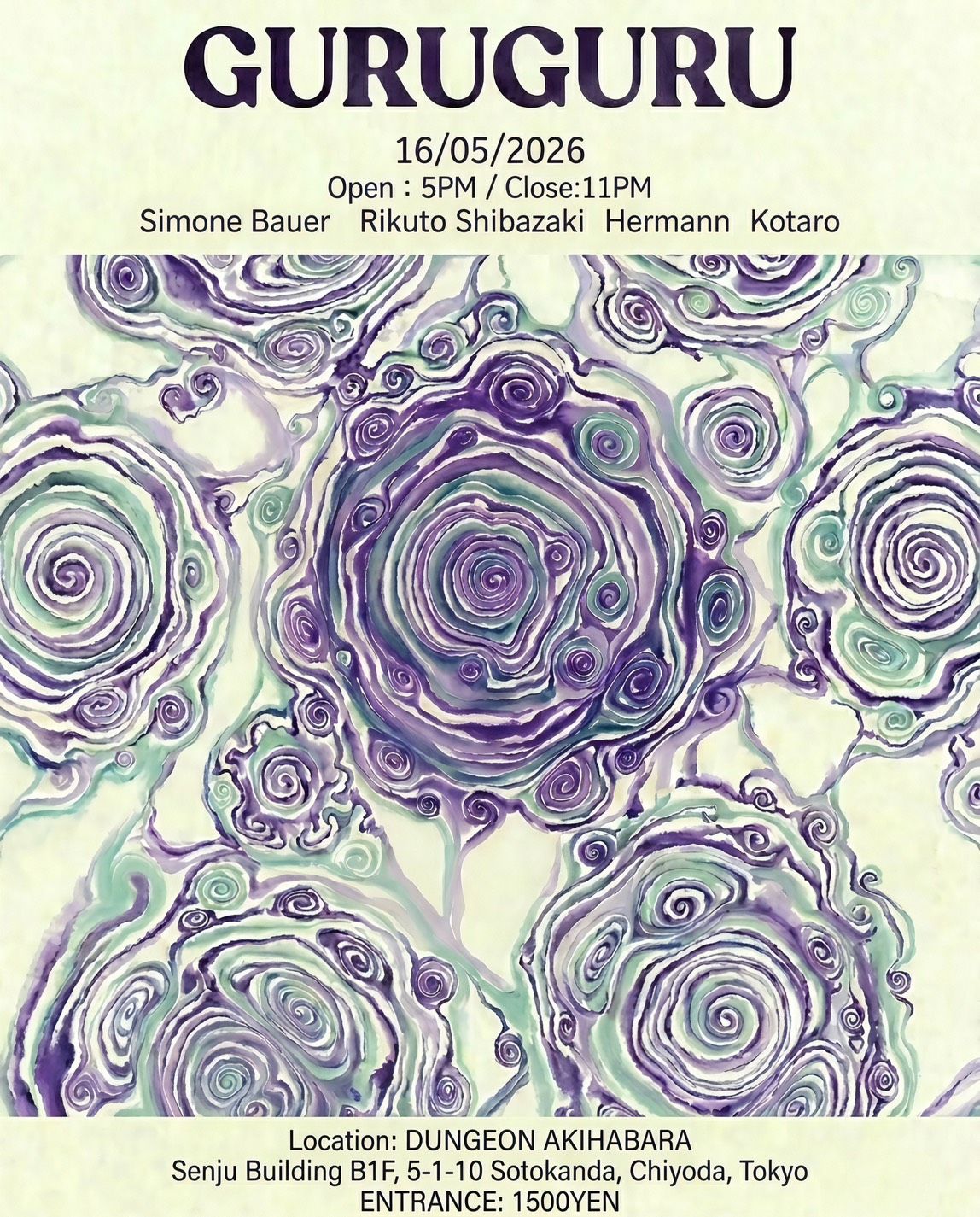 ディープサウンドのテクノやアンビエントミュージックなどのエクスペリメンタル・ミュージックに焦点を当てたマルチメディアプロジェクトの”GURUGURU”が、第一回目のローンチパーティーをDungeon Akihabaraにて始動する。今回は、ベルリンからSimone Bauerを招聘。イタリア・テルニ出身のSimone Bauerは、ディープかつヒプノティック・テクノの旗手として異彩を放つアーティストだ。ドラマーとしてのバックグラウンドと自然への深い愛着を原動力に、有機的な響きとシンセティックな質感を一つの呼吸へと昇華させる。Sure ThingやAnnulled、Accents Recordsといった名門レーベルからのリリースで高く評価される彼のサウンドデザインは、内省的な瞑想を誘うディープなパターンから、自然界の音色を纏った軽やかなアンビエンスまで多岐にわたる。高密度でありながらどこか高揚感を感じさせる、その唯一無二の没入体験をぜひ体感してほしい。ディープサウンドのテクノやアンビエントミュージックなどのエクスペリメンタル・ミュージックに焦点を当てたマルチメディアプロジェクトの”GURUGURU”が、第一回目のローンチパーティーをDungeon Akihabaraにて始動する。今回は、ベルリンからSimone Bauerを招聘。イタリア・テルニ出身のSimone Bauerは、ディープかつヒプノティック・テクノの旗手として異彩を放つアーティストだ。ドラマーとしてのバックグラウンドと自然への深い愛着を原動力に、有機的な響きとシンセティックな質感を一つの呼吸へと昇華させる。Sure ThingやAnnulled、Accents Recordsといった名門レーベルからのリリースで高く評価される彼のサウンドデザインは、内省的な瞑想を誘うディープなパターンから、自然界の音色を纏った軽やかなアンビエンスまで多岐にわたる。高密度でありながらどこか高揚感を感じさせる、その唯一無二の没入体験をぜひ体感してほしい。ローカルシーンからはRikuto Shibazaki, Hermann(tnseei B2B Kurea), Kotaroが登場する。Kotaroは、東京のシーンで今最も盛り上がりを見せるテクノパーティの一つ、EnsiteのFounderである。テクノのみならず、ジャンルレスなフィールドで自身の持つサイケデリックを表現し続けるDJである。今回この新プロジェクトである”GURUGURU”の運営を行う。Rikuto Shibazakiは、東京を中心に活動するDJ。2024年より活動を開始。強固な低音を軸に、多層的なリズム構造と複数の時間感覚を織り交ぜながら、身体と精神の両面に作用する流動的なサウンドを展開する。遊牧民の精神性をテーマにしたテクノパーティ「Nomadlinq」を共同主催。国内外の先鋭的なアーティストとともに、音を通じて新たな関係性とコミュニティを生み出している。今回親交の深いKotaroの新プロジェクト始動にあたりその運営にも尽力する。Hermannは、東京を拠点に活動するリスニングイベントである。日々の生活の中でありふれている情報、常に何かを判断して反応し続ける時間から離れ、普段生きている日常とは少し違った空間を提供するイベントだ。そのオーガナイザーであり、電子的で多彩な音色や独特の世界観のある選曲のKureaと、実験的で空間の中に風景を想像させるサウンドのtnseeiがB2Bを行う。今後は音楽のみならず、モーショングラフィックスなどを駆使したマルチメディアにアプローチをする表現の場として拡大していく”GURUGURU”のローンチイベントを見逃すな。