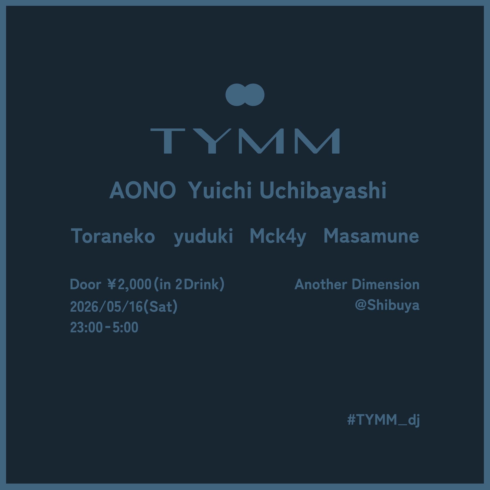 影響を受けたカルチャー・育ってきた世代・そしてクラブへと連なる足跡さえ異なるも、シーンの時好に傾倒しすぎない独自のフリークな見地で音楽(Techno, House, Drum’n’Bass etc…)のエッセンスを追い求める4人が、各回毎に世代を超えた異なるゲストをお呼びし、共に嗜好を重ね合わせていくパーティ「TYMM」