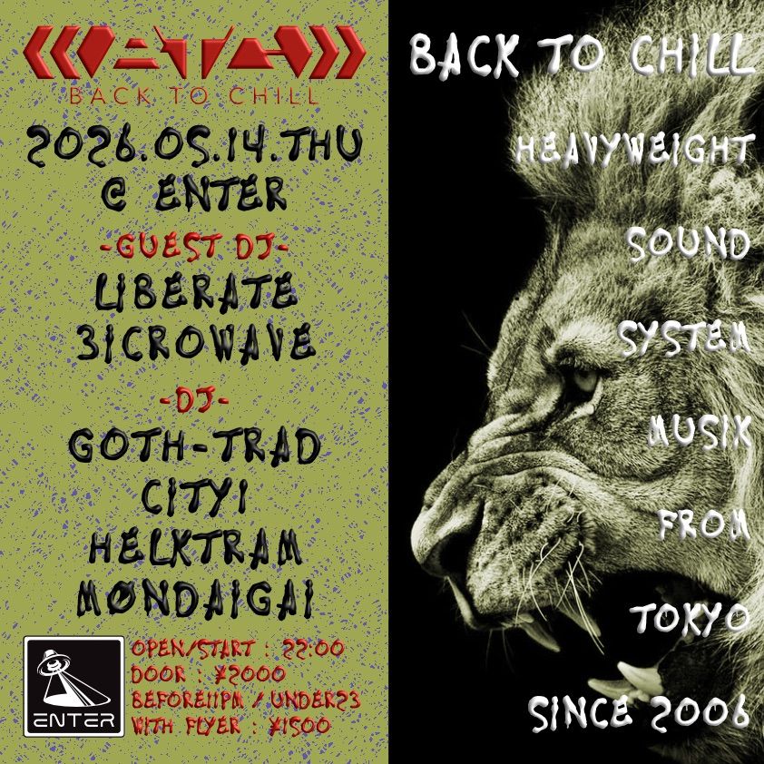 主宰GOTH-TRADがUKのダブステップ・シーンと繋がるきっかけとなった自身のタイトル「Back To Chill」を由来に、2006年に始動した同名のパーティは日本初のレギュラー・ダブステップ・パーティとして話題を呼び、国内のヘッズのみならず、海外のベース・ミュージック・ファンからも注目を集め、今やダブステップ/ベースミュージック・パーティの最高峰かつ代名詞にもなっている。ベースの唸りが床を震わせ、聴衆を低音の沼に引き入れる。体が震えるほどの重低音を体感できる贅沢な平日木曜の夜。