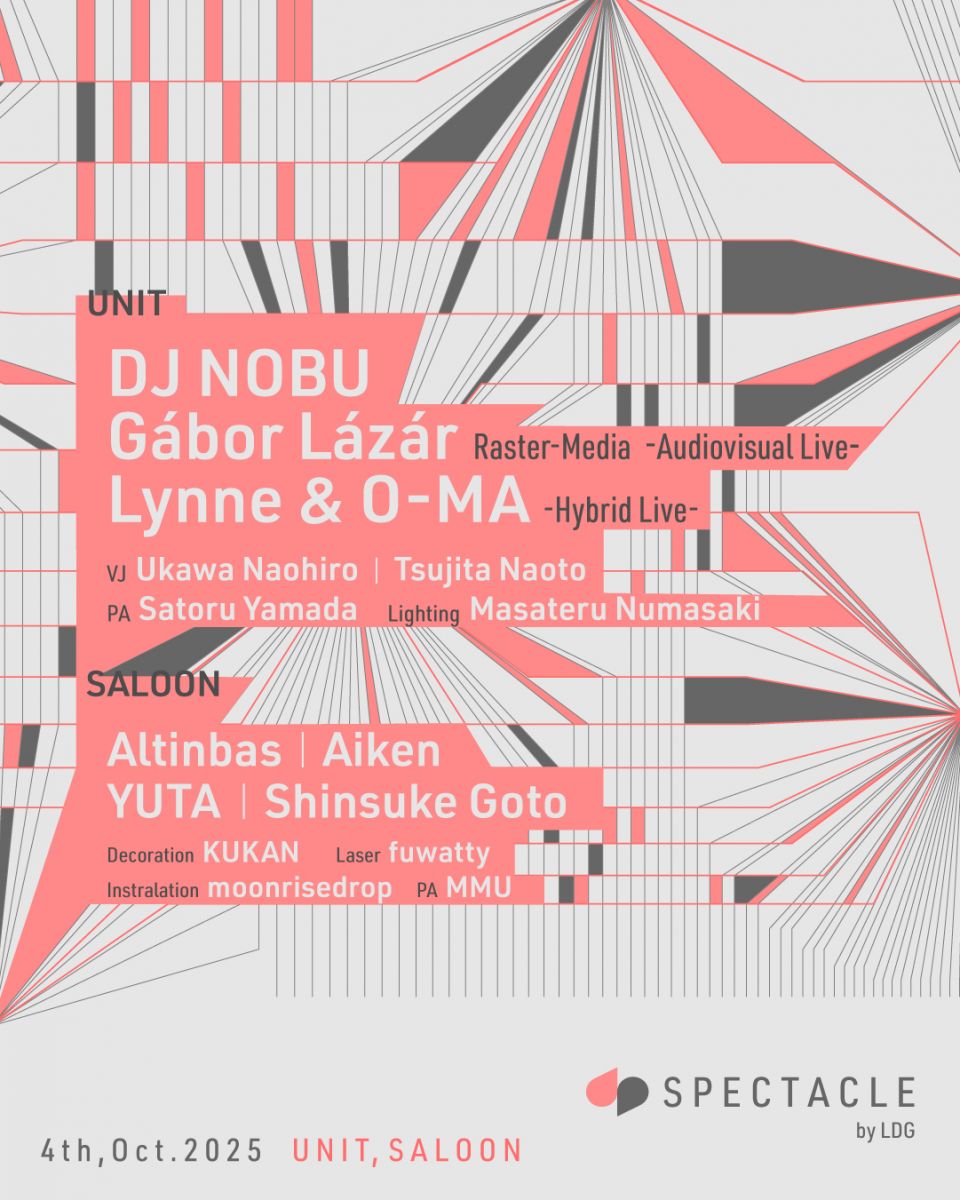 映像演出には、DOMMUNE創始者にしてVJ界のパイオニア UKAWA NAOHIRO がついに登場。また、東京の多様なベニューで活躍する Tsujita Naoto も参加し、SPECTACLEの世界観に彩りを加える。