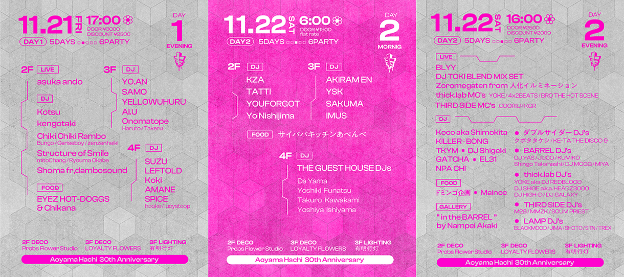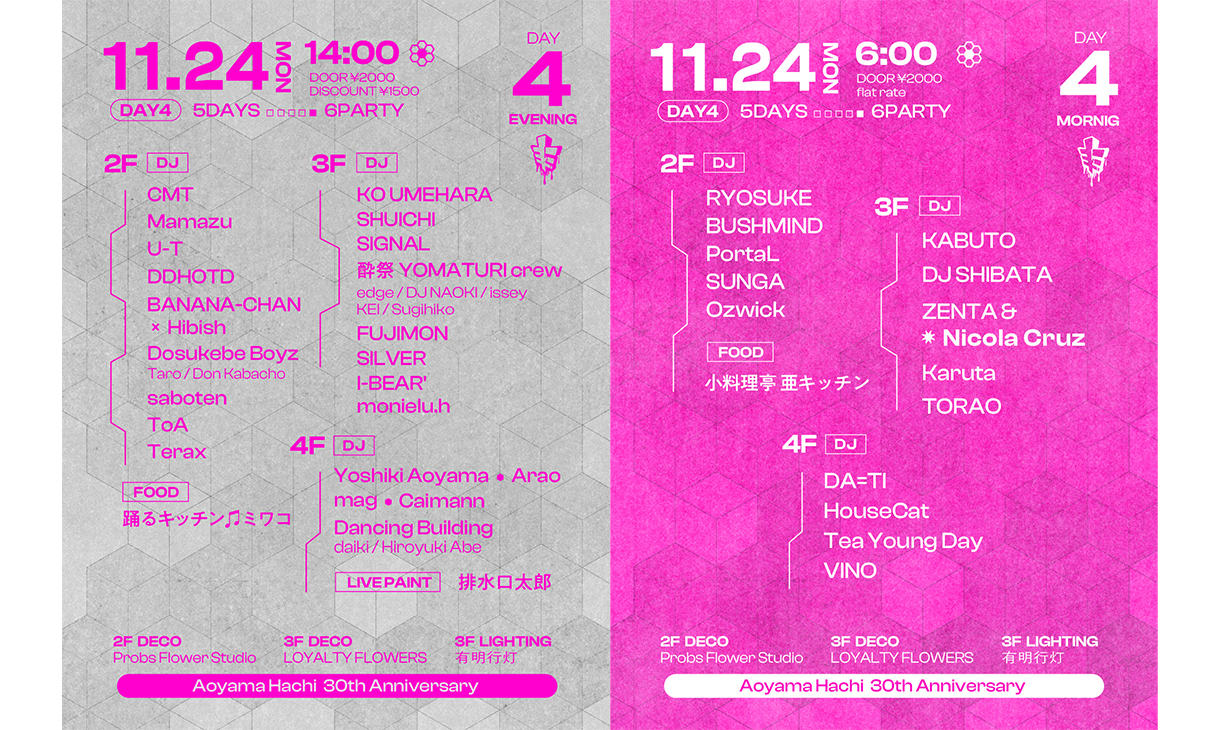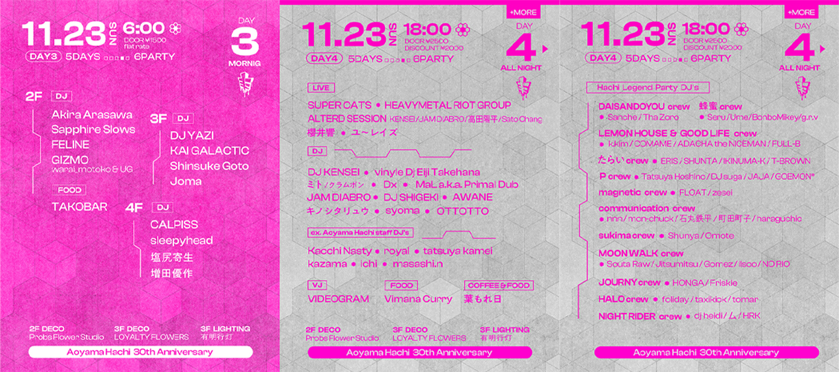 3日目はDJ YAZI、Sapphire Slows、Akira ArasawaらによるAsa-Hachiからスタート。18時からは年に数回しか行われないオールナイトパーティー、そして30周年にちなむ「30時間パーティー」が始動。オープンtoラストのレギュラーパーティーを持つ日本の至宝DJ KENSEIをはじめ、幾度となく歌われてきた青山蜂クラシック「今夜は最高」で知られるCATBOYS改め、三軒茶屋の歌姫YUIMA ENYAを迎えたSUPER CATSが登場。さらに、30年の間に青山蜂に深く関わり、影響を与えてきたDJやスタッフたちも勢揃いし、歴史を感じる夜となるだろう。