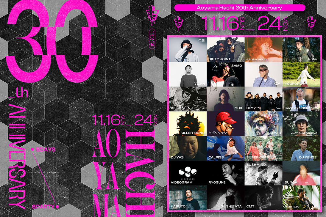 東京・青山の老舗クラブ 青山蜂(AOYAMA HACHI)が2025年11月に30周年を迎える。クラブという業態の形が変わり続ける中、30年にわたり現場を守り抜いてきた稀有な存在だ。その節目を祝う周年ウィークは16日の前夜祭を経て、明日11月21日金からスタートし、総勢200名規模のラインナップで4日間に5パーティーの規模で展開される。今回は、明日11月21日から11月24日にかけて開催されるパーティを各日程ごとに紹介する。