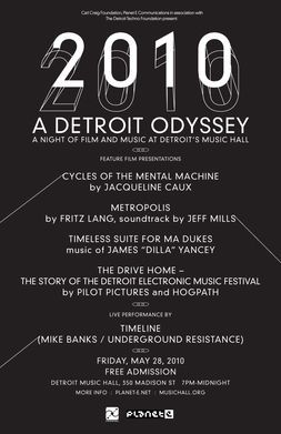 ブルース、ゴスペル、ジャズ、モータウンサウンドなど音楽の息吹が古くから流れているこの街で、その精神が現在のテクノアーティストたちにどのように受け継がれているかを、表現されているショートドキュメンタリー「Cycles of the Mental Machine」、無声映画古典「Metropolis」(2004年にFacricで披露された、Jeff Millsによるイメージトラック付き)や、惜しまれつつも2006年に他界したJ Dillaに捧げたフルオーケストラコンサートの映像「Timeless Suite for Ma Dukes」、2000年~2002年まで開催されていた「Movement」の前身「Detroit Electronic Music Festival」にスポットを当てたドキュメンタリー「The Drive Home」が上映された。