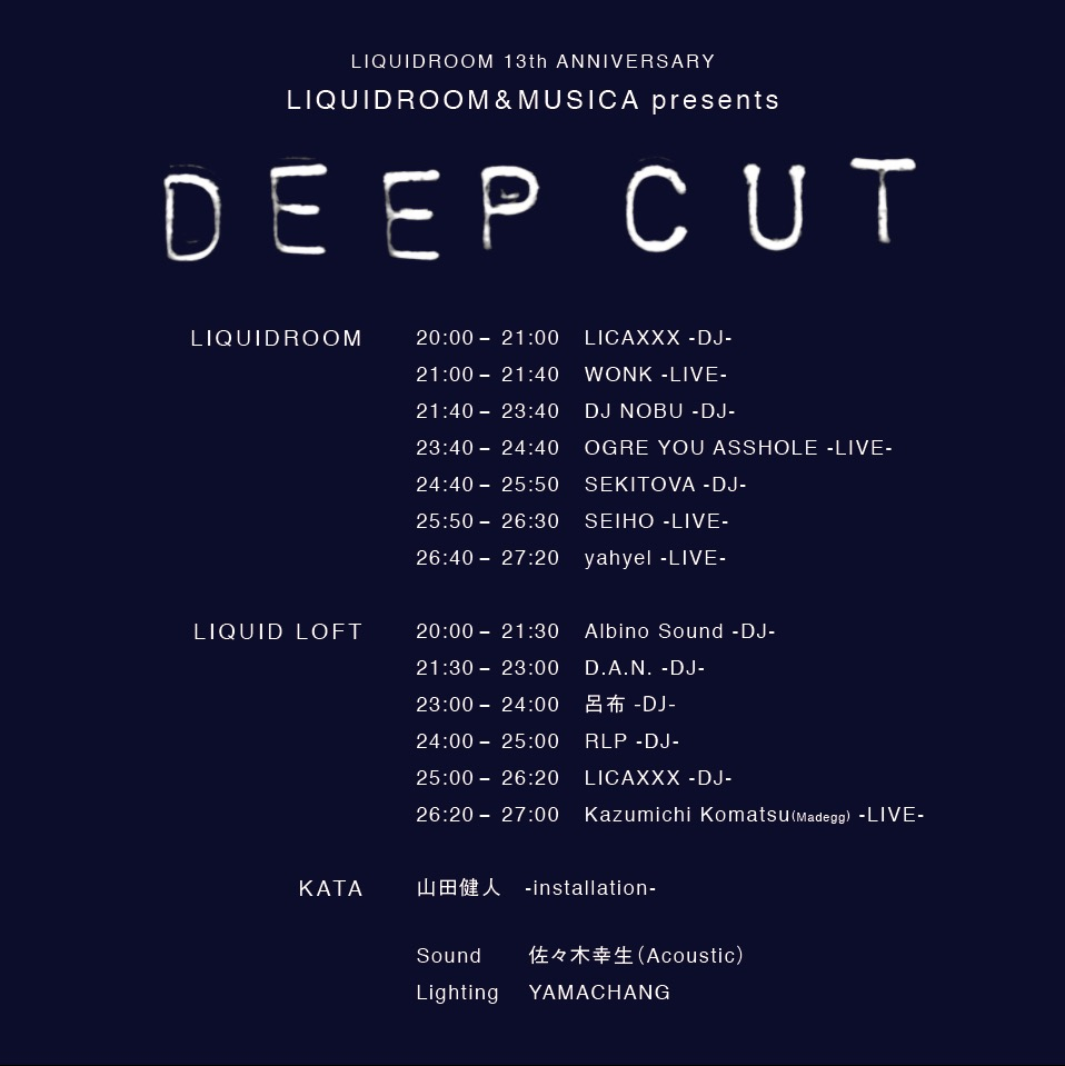 LIQUIDROOMと音楽雑誌「MUSICA」がタッグを組んで、より深く・より自由に・より未知なる音楽体験を探求し、音の中にもっともっとディープにどっぷり遊ぶための、新たなオールナイトイベントを開催します。タイトルは「DEEP CUT」。そのままディープな側面を切り取る、というような意味合いで捉えてもらっても構いませんが、CUTは歌やトラックを表すスラングでもあって、このDEEP CUTという言葉には、「そのアーティストの本当のファンが知っている、自分たちのお気に入りのアルバムやB面曲」という意味もあります。今回はそこからさらに意味を発展させ、様々なアーティストにそれぞれの普段のライヴやアクトとは一味違う、よりディープでより挑戦的なアプローチにトライするステージを展開してもらうことをコンセプトにイベントを企画しました。