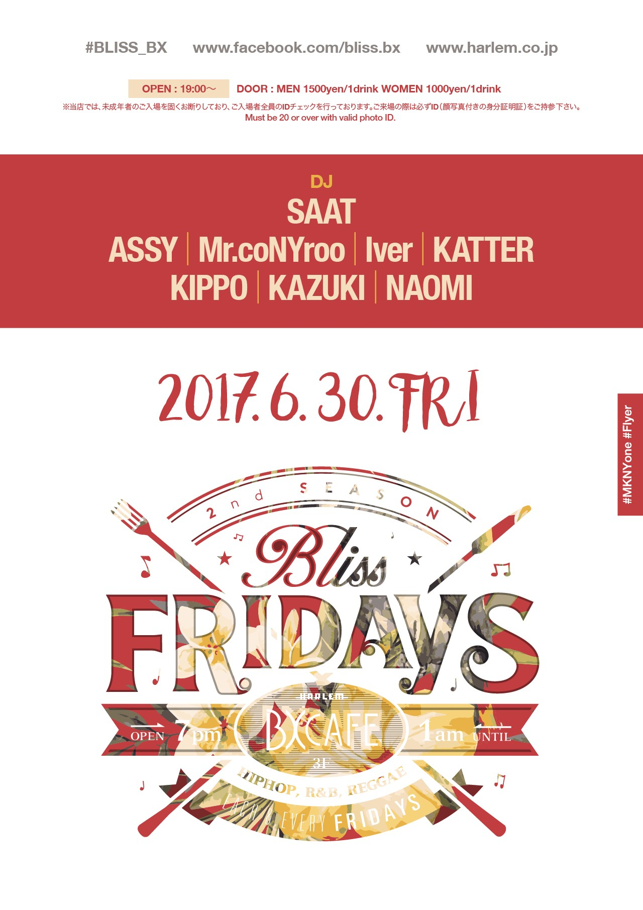 2017.06 30 JUN BLISS FRIDAYS ALLMIX HIPHOP 0 Shares Facebook Twitter google Line DATE: 2017-06-30 FRI OPEN: 19:00 VENUE: PRICE: LINE UP: DJ: SAAT, Mah, Assy, Mr.coNyroo, KIPPO, KAZUKI, NAOMI