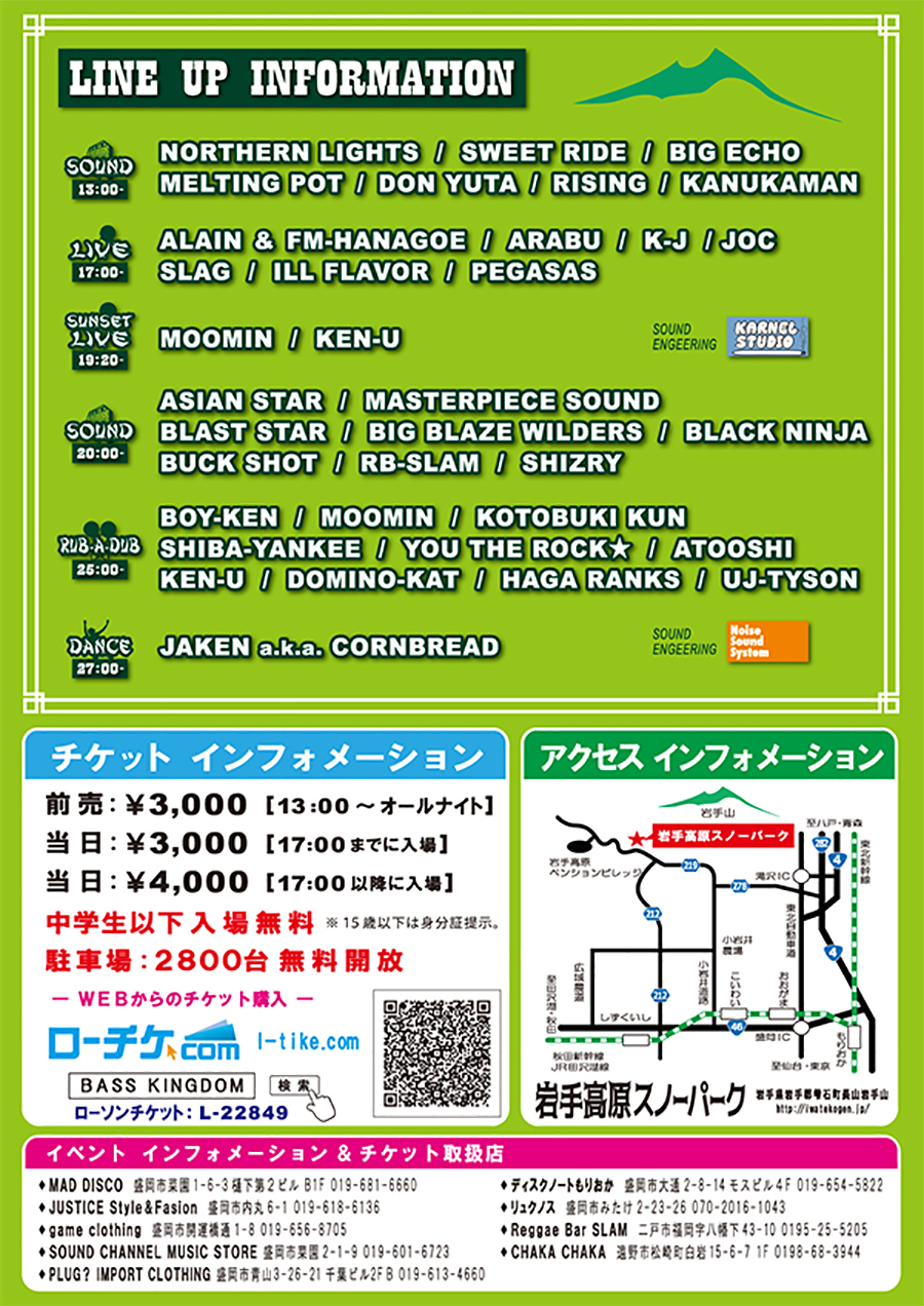 - 当日: ¥3,000【17:00までに入場】 ¥4,000 【17:00以降に入場】前売:¥3,000 その他:15歳未満無料入場 ※15歳以下は身分証提示