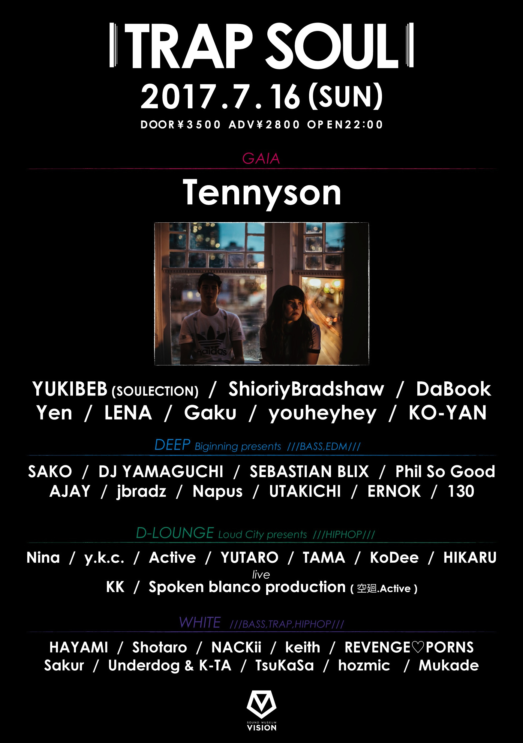 2017.07 16 JUL TRAP SOUL PICK UP BASS MUSIC 0 Shares Facebook Twitter google Line 実券をお買い求めの方はこちらからご購入頂けます。 ¥2,800 DATE: 2017-07-16 SUN OPEN: 22:00 VENUE: PRICE: ¥3500 DOOR/¥2800 ADV LINE UP: SPECIAL ACT:Tennyson