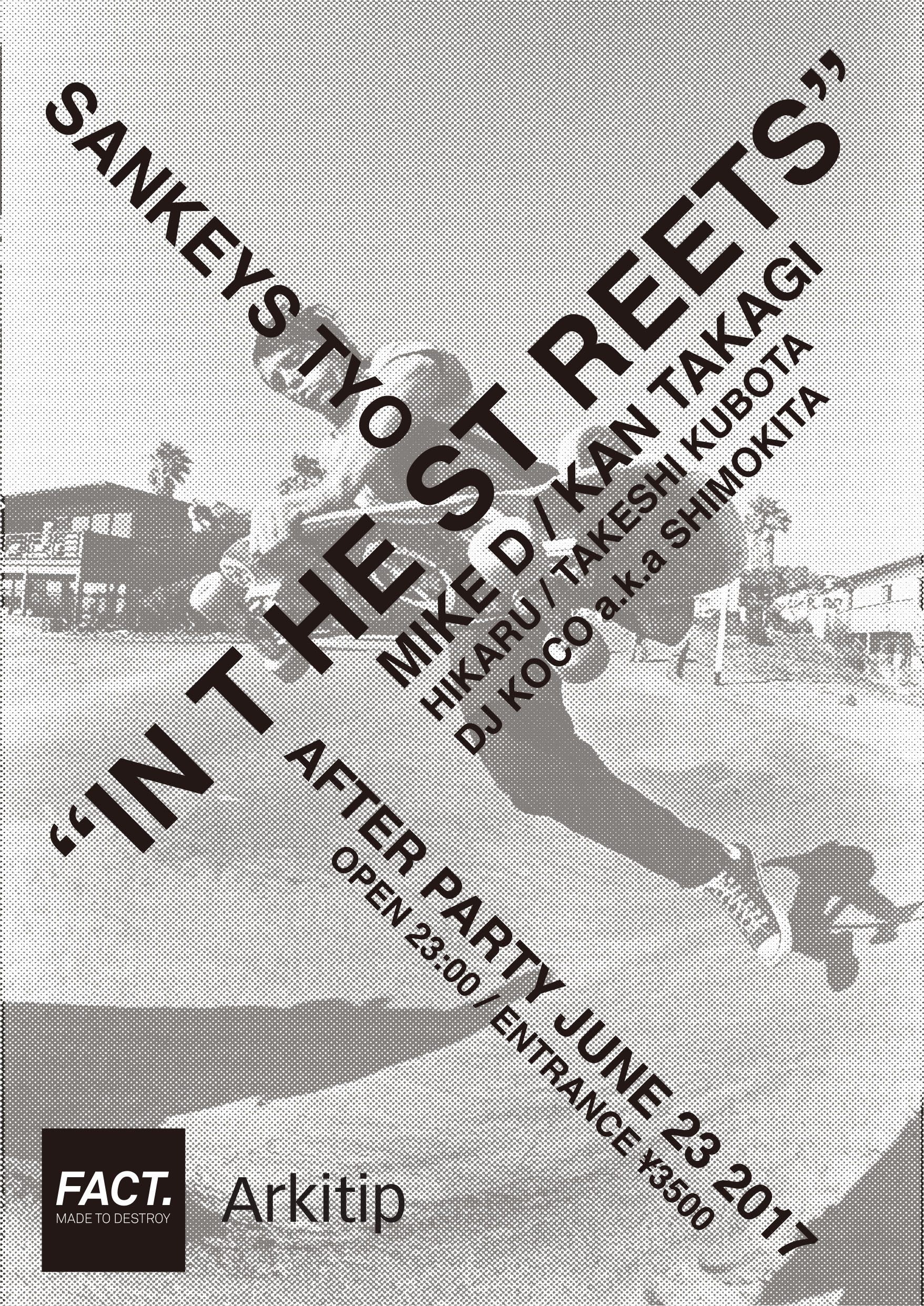DC ShoesやDroorsなど、90’sスケートカルチャーを代表するブランドの創設に携わってきたDamon Wayが新たに立ち上げたDIYカルチャーをテーマにしたブランドFACT.と限定生産のアートマガジンの出版とサブカルチャーのキュレーションで知られるArkitipとのパートナーシップによって6種類のTeeから成るカプセルコレクションをこの度発表。本コレクションはスケートボード界伝説のレンズマンGrant Brittainが撮影した80年代のストリート・スケーティングの記憶がテーマとなり、このコレクションのローンチを記念して80年代のアイコニックな写真を30点集めたエキジビジョンを3日間限定で原宿のBATSU GALLERYにて開催する。23日のレセプションには90'sストリート系定番スケーターやパンクスも含め、幅広いファンを持ち、あらゆる角度から話題作を放ち続けてきた大御所ヒップホップ・ユニットBeastie BoysのMike Dが来日しBGMを提供、Skatelabの貴重な80年代のコンプリートスケートボードのインスタレーションも見ることができる。さらにその夜には、渋谷Sankeys TYOにてMike D等、豪華出演者が出演するアフターパーティを開催する。プレミアムな一夜に是非参加してほしい。