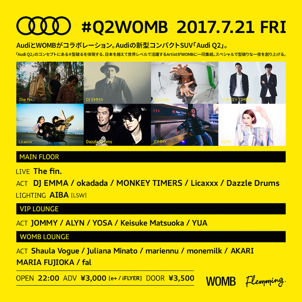 “Audi Q2” のコンセプトにある #型破る を体現する、日本を越えて世界レベルで活躍する Artist が WOMB に一同集結。スペシャルで型破りな一夜を創り上げる。