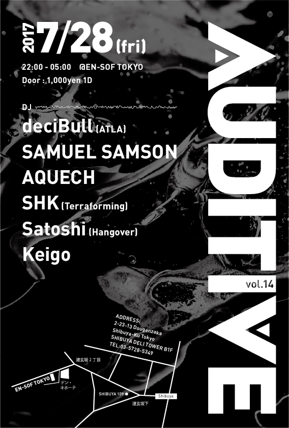 En-Sof Tokyoを拠点に多彩なベースミュージックを至高のサウンドシステムと空間でお届けするイベントAUDITIVE。第14回目となる今回は東京アンダーグラウンドシーンで活躍しているドラムンベースDJをゲストに招いてセッションを開催。個性豊かなゲストDJが繰り広げる世界観をEn-Sofのサウンドと空間で体感してほしい。