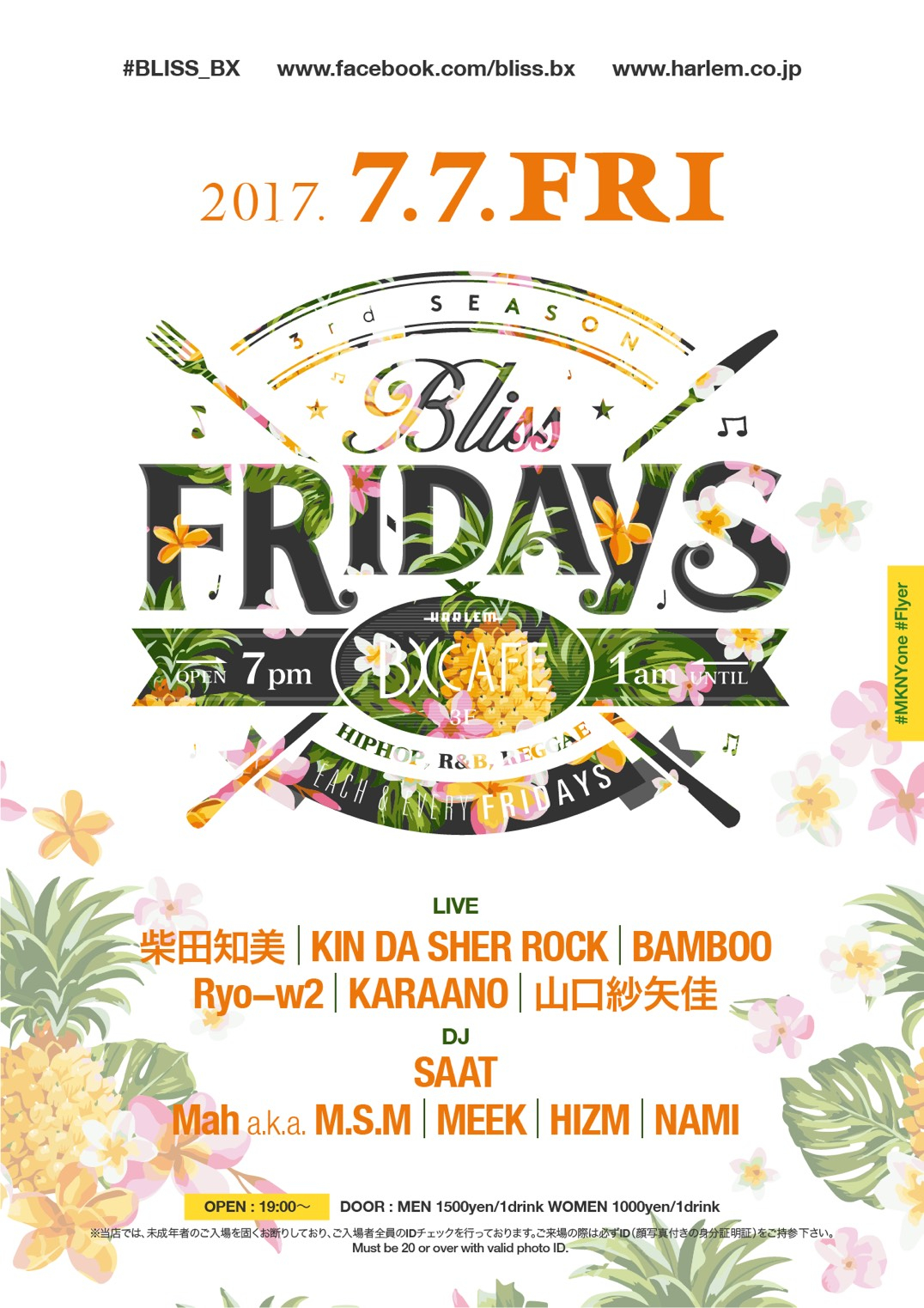 2017.07 07 JUL EACH & EVERY FRIDAYS BLISS FRIDAYS ALLMIX HIPHOP 0 Shares Facebook Twitter google Line DATE: 2017-07-07 FRI OPEN: 19:00 VENUE: PRICE: LADIES ¥1,000/1d MEN ¥1,500/1d LINE UP: LIVE: 柴田知美, BAMBOO, Ryo-w2, KARAANO DJ: SAAT, Mah a.k.a. M.S.M, MEEK, HIZM, NAMI
