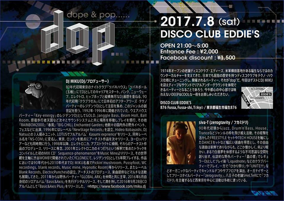 米軍横田基地がある福生ならではのカウンターカルチャーを支えてきた日本でも屈指の歴史を持つディスコクラブをテクノ・ハウス仕様にチューニングし、開催されるパーティー、それが”dop”だ。