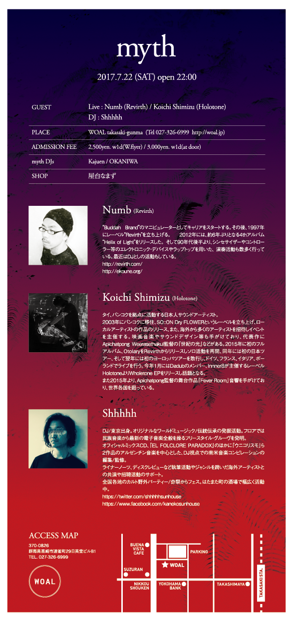 Revirthの立ち上げなど多大な功績を残すNumbがモジュラーシンセによるパーフォーマンスをWOALで初披露。バンコク在住でDadubのInnner8のレーベルHolotoneからのリリースも記憶に新しいKoichi Shimizuと伴にモジュラーシンセのパフォーマンスが2本となる。そしてDjは、民族音楽から最新の電子音楽全般をプレイしオリジナルのフリースタイル・グルーヴを披露するShhhhhが持ち味を十二分に発揮するであろうこの時期に登場。そして、フルーツ主催の果樹園とレジデントのOKANIWAがパーティーの導入をはかる。