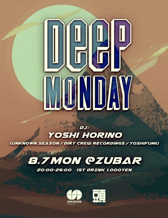 2017.08 07 AUG ディープマンデー DEEP HOUSE TECH HOUSE DISCO SOUL FUNK 0 Shares Facebook Twitter google Line DATE: 2017-08-07 MON OPEN: 20:00 VENUE: PRICE: 1000円(1ドリンク) LINE UP: Yoshi Horino(UNKNOWN season / Dirt Crew Recordings / YoshiFumi) 毎月第1月曜日開催。 暑い夏、音楽、お酒。 楽しみましょう!