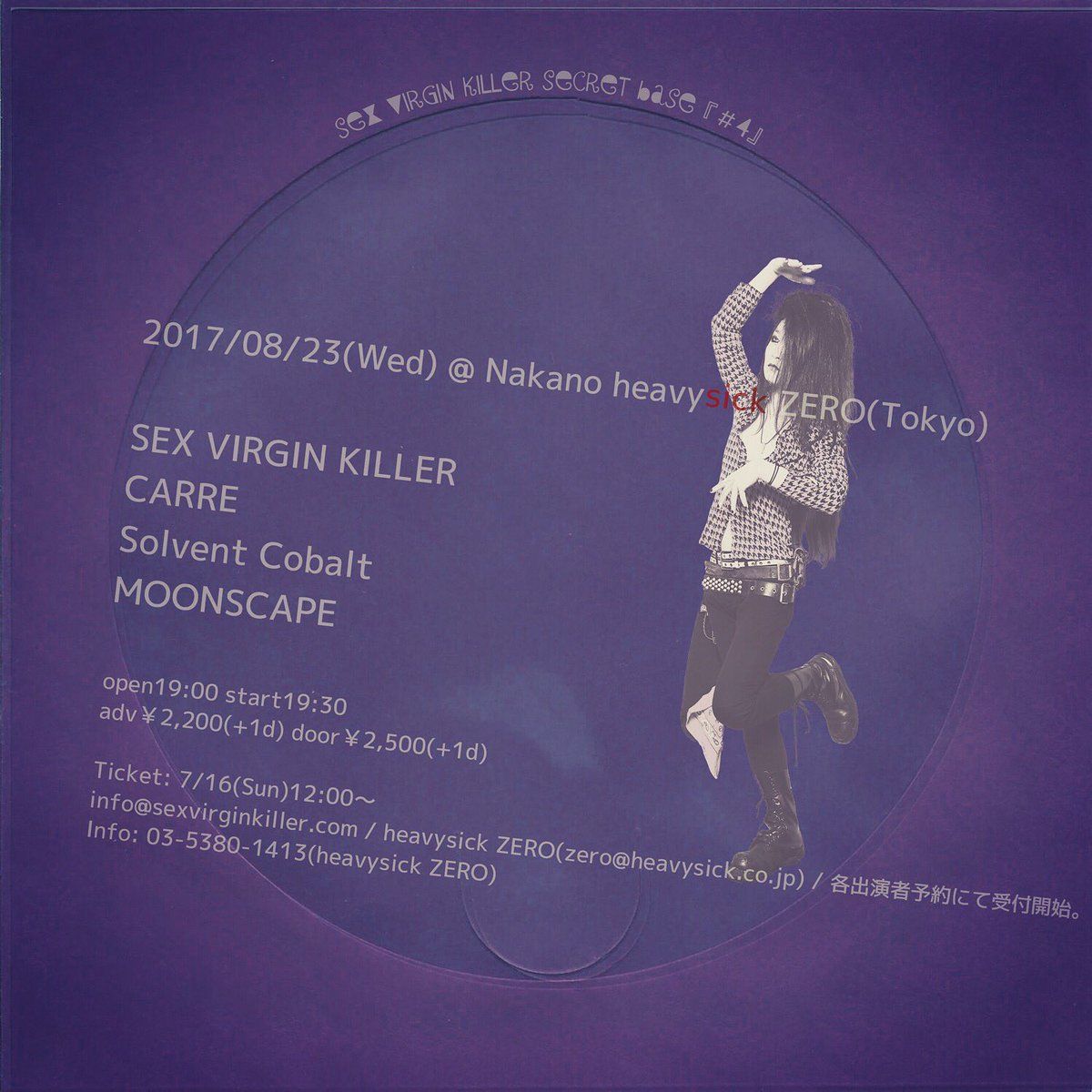2017.08 23 AUG SEX VIRGIN KILLER secret base『#4』【NIGHT TIME】 OTHER 0 Shares Facebook Twitter google Line DATE: 2017-08-23 WED OPEN: 19:00 VENUE: PRICE: 【DOOR】2500YEN(1D別) 【W.F】2200YEN(1D別) LINE UP: LIVE: SEX VIRGIN KILLER CARRE Solvent Cobalt MOONSCAPE