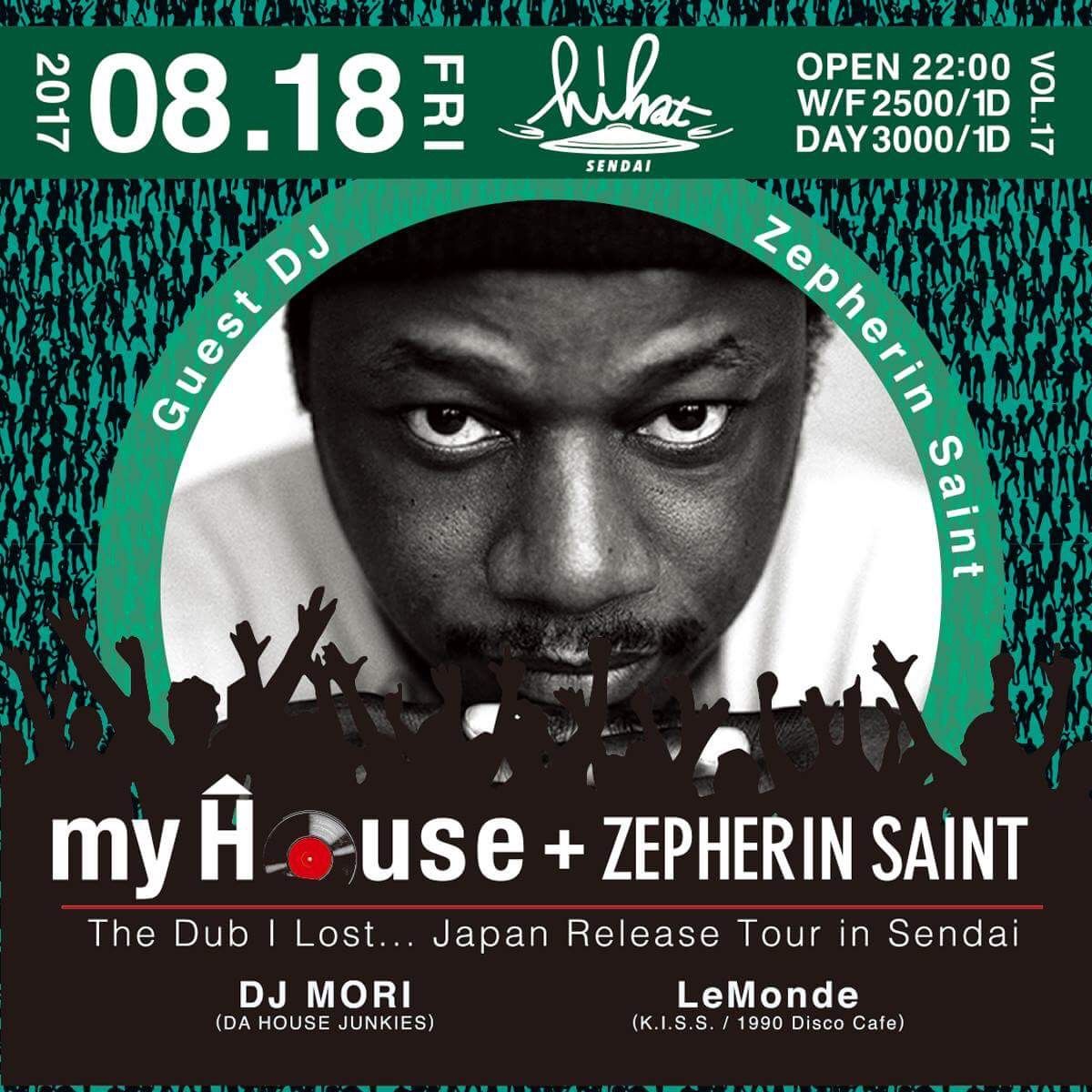 2017.08 18 AUG my House+ Zepherin Saint vol.17 HOUSE DEEP HOUSE DISCO SOUL FUNK 0 Shares Facebook Twitter google Line DATE: 2017-08-18 FRI OPEN: 22:00 VENUE: PRICE: DOOR:3000/1D WF:2500/1D LINE UP: Guest DJ Zepherin Saint (Tribe Records) DJ MORI(DA HOUSE JUNKIES) Le Monde(K.I.S.S. / 1990 Disco Cafe) ついに現在のAfro / Soulful Houseにおいて最重要レーベル〈Tribe Records〉の共同創立者Zepherin Saintが 初仙台へ。 場所はMartin Audioを設置している 仙台の良質な音箱、HI-HATです。