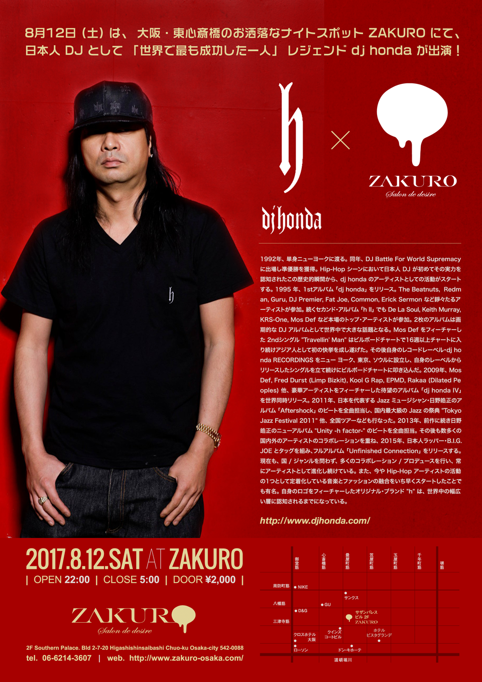 8月12日 (土) は、大阪・東心斎橋のお洒落なナイトスポット ZAKURO にて、日本人 DJ として「世界で最も成功した一人」レジェンド dj honda の出演が決定!今でこそ、DJ ネームのロゴ表記がポピュラーとなったが、dj honda は誰よりも早く「h」のマークを世界的に認知させ、日本人 DJ として初めて世界に認められた人物であり、Japanese Hip Hop シーンのオリジネイター。1992年より、ニューヨークでの活動を開始して以来、自身のレーベル "dj honda RECORDINGS" からリリースしたシングルを立て続けにビルボードチャートに叩き込み、数多くの作品をリリース。昨今では、日本人ラッパー・B.I.G.JOE とタッグを組み、フルアルバム "Unfinished Connection" のリリースや、日本を代表する Jazz ミュージシャン・日野皓正のアルバム "Aftershock" の制作など、国やジャンルを問わず、多くのアーティスト達とコラボレーション、プロデュースを行い、常にアーティストとして進化し続けている。その他の出演者には、DMC WORLD DJ CHAMPIONSHIP アジア人初の世界ランク3位という偉業を成し遂げた GM YOSHI を筆頭に、日本のハウスシーンの第一人者 Shigekazu Yagi (ECSTASY BOYS) のラストプレイとなる Final DJ set、DMC ONLINE DJ CHAMPIONSHIP 2013 FINAL の DJ ELMU など、日本が世界に誇る実力派 DJ が総出演。豪華ラインナップでお贈りする "dj honda × ZAKURO" をお見逃し無く!