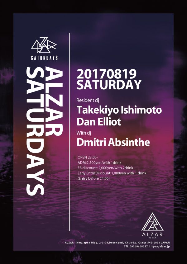 大阪を拠点に活動する数多くのDJから選び抜いた5名を土曜日のレジデントとして迎え入れ、国内をはじめとした各地に点在する優れたアーティストを共演者として招聘し開催するALZAR Saturdays。第3土曜日は、Progressive Houseを軸に、DeepなTranceや疾走感のあるTechnoなど、現場の雰囲気から思い描いたストーリーを基にMixするTakekiyo Ishimotoと、Progressive House&TribalからTech House&Technoへと幅広い音楽を操り、常に完璧なmixと音楽でダンスフロアを盛り上げ、決してクラバーの期待を裏切らないDan Elliotの2人がレジデントを務める。