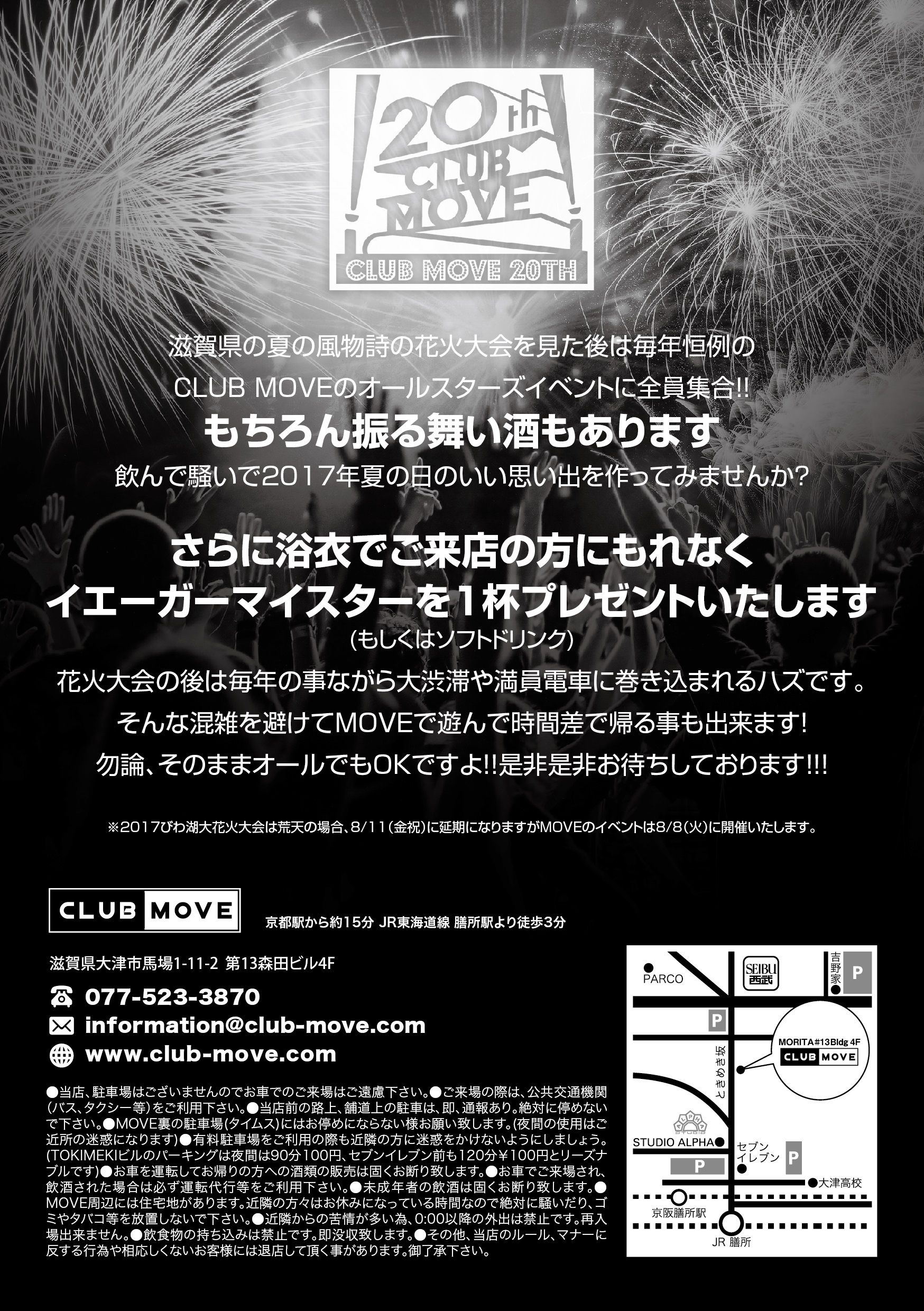 ※2017びわ湖大花火大会は荒天の場合、8/11(金祝)に延期になりますがMOVEのイベントは8/8(火)に開催いたします。