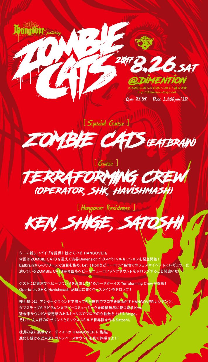 今回はZOMBIE CATSを迎えて渋谷Dimensionでのスペシャルセッションを緊急開催!Eatbrainからのリリースで注目を浴び、Let it Rollなどヨーロッパ各地でのフェスやイベントにレギュラー出演しているZOMBIE CATSが今回もヘビーなニューロファンクサウンドをドロップすること間違いない!