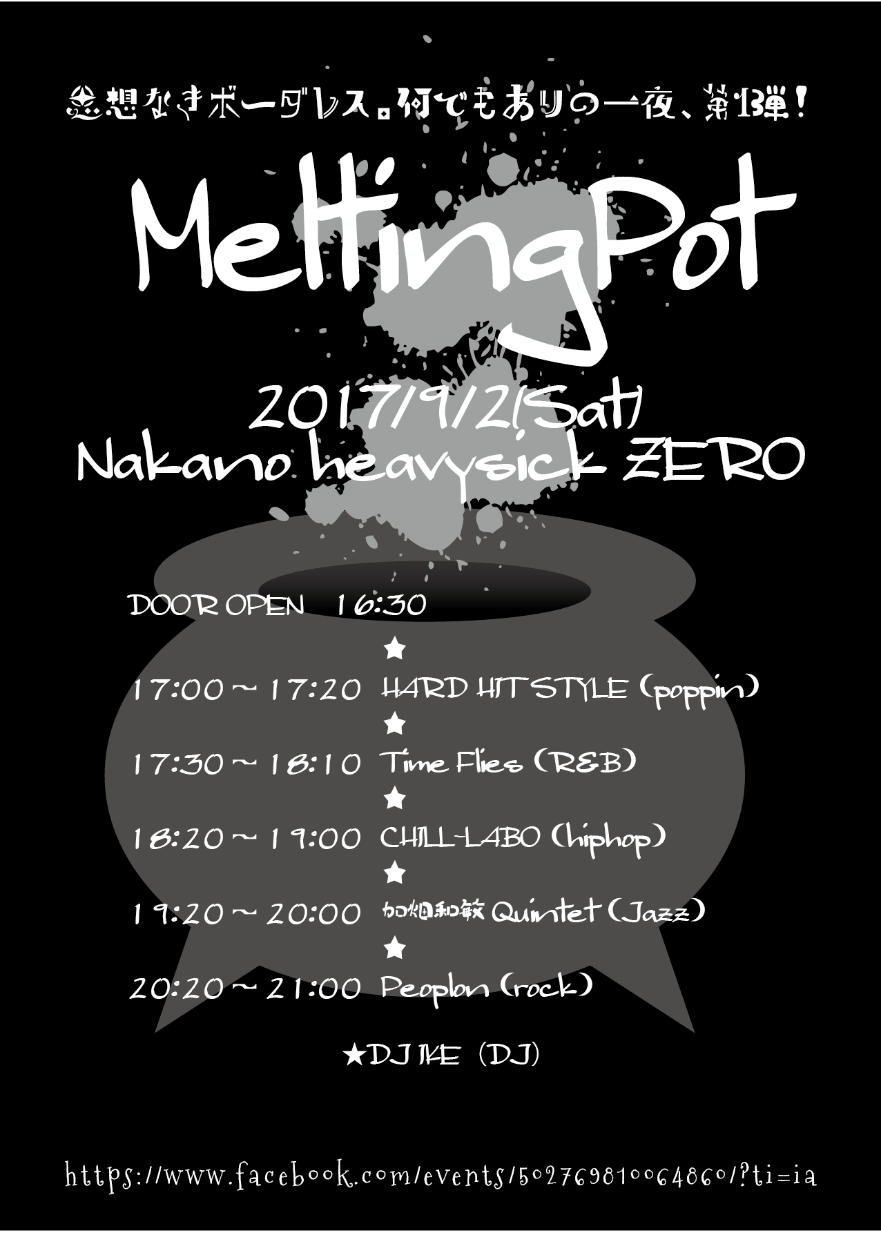 2017.09 02 SEP Melting Pot【NIGHT TIME】 CROSSOVER 0 Shares Facebook Twitter google Line DATE: 2017-09-02 SAT OPEN: 16:30 VENUE: PRICE: 【DOOR】1000YEN(1D別) LINE UP: LINE UP: Peoplon 加畑和敏 Quinted CHILL-LABO Time Flies HARD HIT STYLE DJ IKE