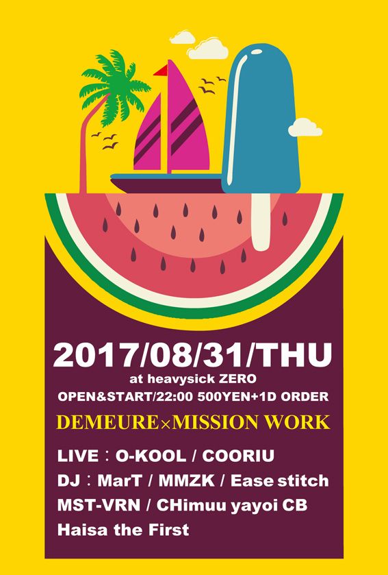 2017.08 31 AUG DEMEURE×MISSION WORK OTHER 0 Shares Facebook Twitter google Line DATE: 2017-08-31 THU OPEN: 22:00 VENUE: PRICE: 【DOOR】500YEN+1drink oder LINE UP: LIVE: O-KOOL COORIU DJ: MarT MMZK Ease stitch MST-VRN CHimuu yayoi CB Haisa the First