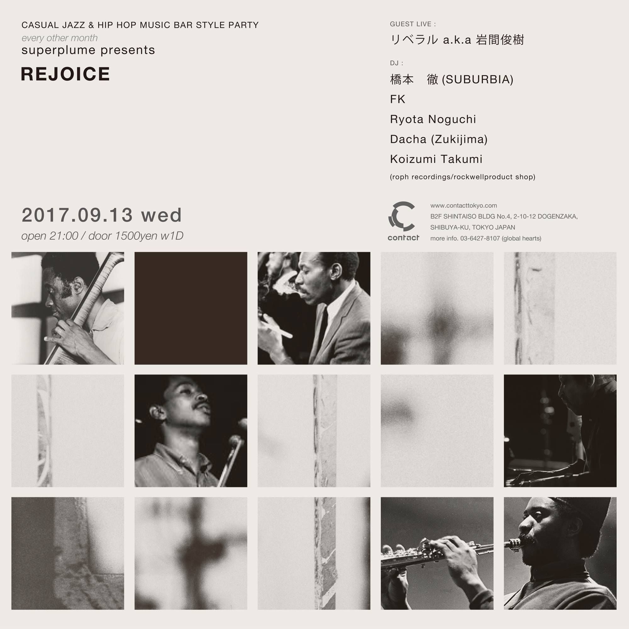 “Rejoice”は選曲家 橋本徹、Nujabesのマネージャーやレーべルマネージメントを務め、現在はRoph RecordingsをマネージメントをするKoizumi Takumi、Hydeout Productionsの旗艦店Tribe (+Guinness Records)からリリースし、同店のスタッフでもある FKを中心に、腕利きのセレクターが音楽を担当する。「等身大かつ自分達にとってリアルなジャズやヒップホップ」「本当に音楽を愛する人たちが安心して和める場所」をコンセプトに掲げ、ジャズ、ヒップホップを中心に良質な音楽を気ままに楽しめるイベント。
