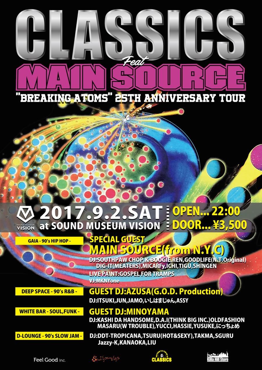 2017.09 02 SEP CLASSICS HIPHOP R&B SOUL FUNK 0 Shares Facebook Twitter google Line DATE: 2017-09-02 SAT OPEN: 22:00 VENUE: PRICE: ¥3500 DOOR LINE UP: 【GAIA】 SPECIAL GUEST:MAIN SOURCE DJ:SOUTHPAW CHOP/K-BOOGIE/DJ REN/GOODLIFE/DIG-IT/MICARFy/ICHI/TIGU/SHINGEN VJ:MKNYone LIVE PAINTS:GOSPEL FOR TRAMPS 【DEEP SPACE】 GUEST:DJ AZUSA DJ:ITSUKI/JUN/JAMO/いしはまじゅん/ASSY 【WHITE】 GUEST DJ:DJ MINOYAMA DJ:KASHI DA HANDSOME/D.A.I.(THINK BIG INC)/OLDFASHION/MASARU/DJ YUCCI/HASSIE/DJ YUSUKE/にっちょめ 【D-Lounge】 DDT-TROPICANA/TSURU/TAKMA/Sguru/JAZZY-K/kanaoka/liu HIP HOP黄金期の90年代にスポットをあてる『CLASSICS』にMAIN SOURCEが登場!! YOU MUST BE OVER 20 本公演では20歳未満の方のご入場は一切お断りさせて頂きます。年齢確認の為、ご入場の際に全ての方にIDチェックを実施しておりますので、写真付き身分証明書をお持ち下さい。