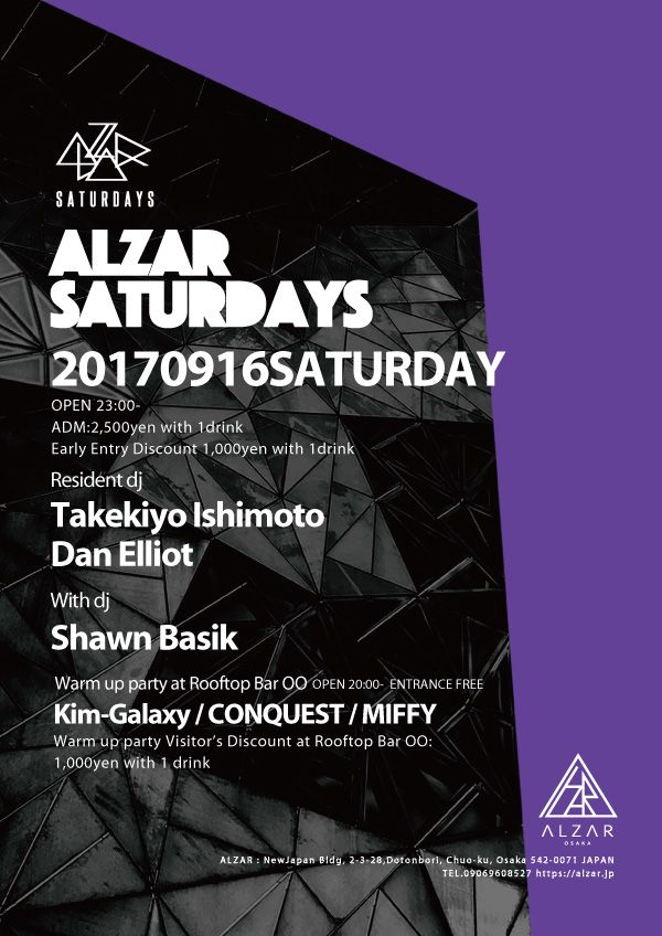大阪を拠点に活動する数多くのDJから選び抜いた5名を土曜日のレジデントとして迎え入れ、国内をはじめとした各地に点在する優れたアーティストを共演者として招聘し開催するALZAR Saturdays。第3土曜日は、Progressive Houseを軸に、DeepなTranceや疾走感のあるTechnoなど、現場の雰囲気から思い描いたストーリーを基にMixするTakekiyo Ishimotoと、Progressive House&TribalからTech House&Technoへと幅広い音楽を操り、常に完璧なmixと音楽でダンスフロアを盛り上げ、決してクラバーの期待を裏切らないDan Elliotの2人がレジデントを務める。