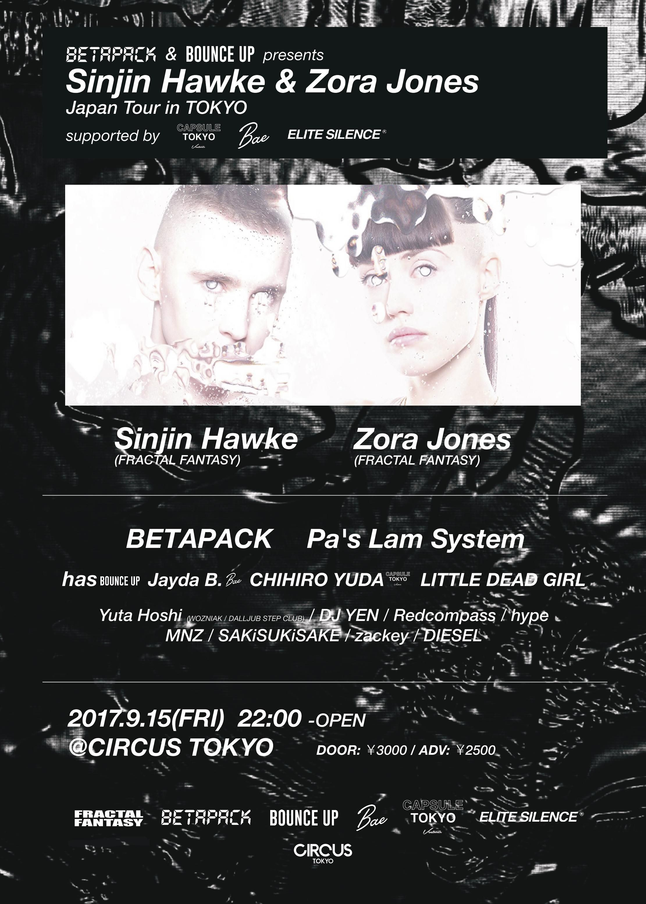Kanye Westのプロディース、Just Blazeとのコラボなどを経て先日リリースしたアルバムFIrst Opusも話題のSinjin Hawke、Fractal Fantasyのメンバーとして活躍するZora Jones。最先端のExperimental Club Musicを現場で感じることができる一夜となることは間違いない。