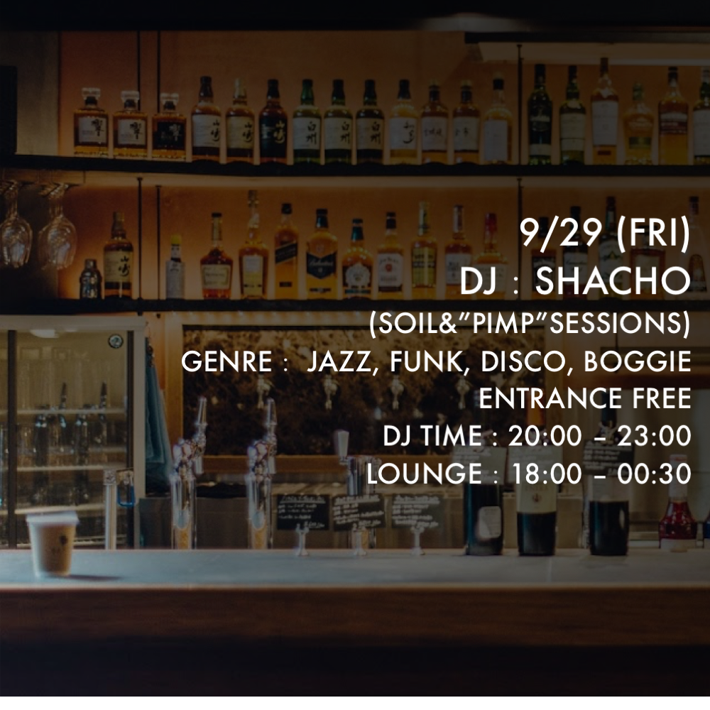 2017.09 29 SEP DJ Lounge JAZZ DISCO SOUL FUNK CROSSOVER 0 Shares Facebook Twitter google Line DATE: 2017-09-29 FRI OPEN: 20:00 VENUE: PRICE: ENTRANCE FREE LINE UP: DJ Shacho 9/29 ( Fri ) DJ Shacho Genre:JAZZ, FUNK, SOUL, DISCO, BOGGIE 9/30 ( Sat ) TBD Genre: DJ TIME:20:00~23:00 Bar Open:18:00~ Night Lounge:18:00~0:30 Entrance:Free