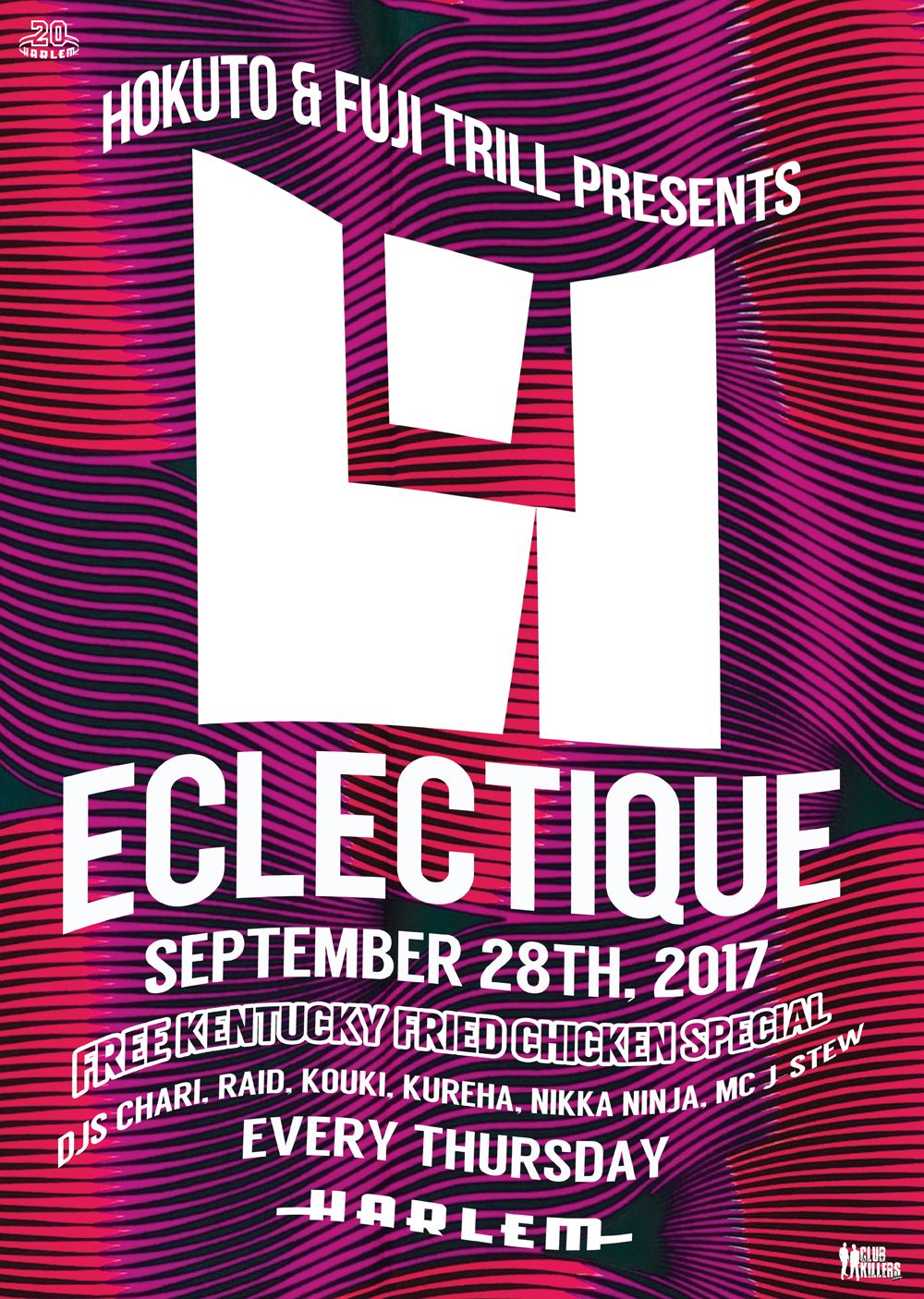 DJ HOKUTOが5年に渡り毎年2回のヨーロッパツアーを敢行する中で、アムステルダムで出会った今までのDJの常識を覆すDJスタイル“Eclectic”。そして、音楽のメッカヨーロッパで毎夜繰り広げられる、自由な音楽感と遊びのスタイルに衝撃を受け、そのパーティ感とDJスタイル再現するパーティとしてスタートしたのが『ECLECTIQUE』。