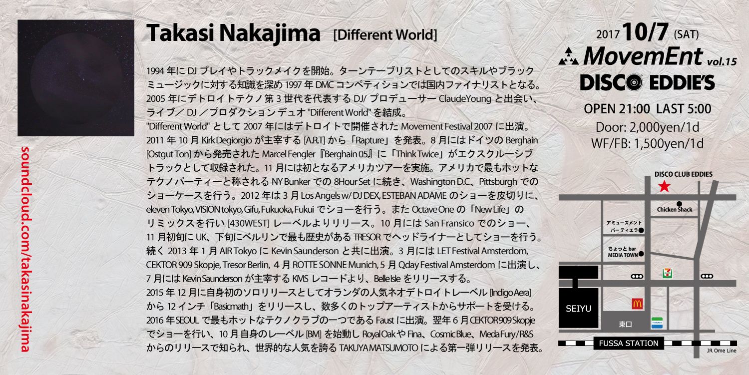 ヘッドライナーの"Takasi Nakajima"はデトロイトテクノ第3世代を代表するDJ/プロデューサー"Claude Young"とのデュオ"Different World" で幾多の名曲を生み出し、ベルリンのTRESORをはじめ世界各国のトップCLUBでプレイ、その後オランダのレーベル[Indigo Aera]からソロリリースを果たし、今夏自身のレーベル[BM]を始動。国内における最後の公式プレイはAIRでのKevin Saunderson来日時だとか、、是非この貴重な機会をお見逃しなく!!