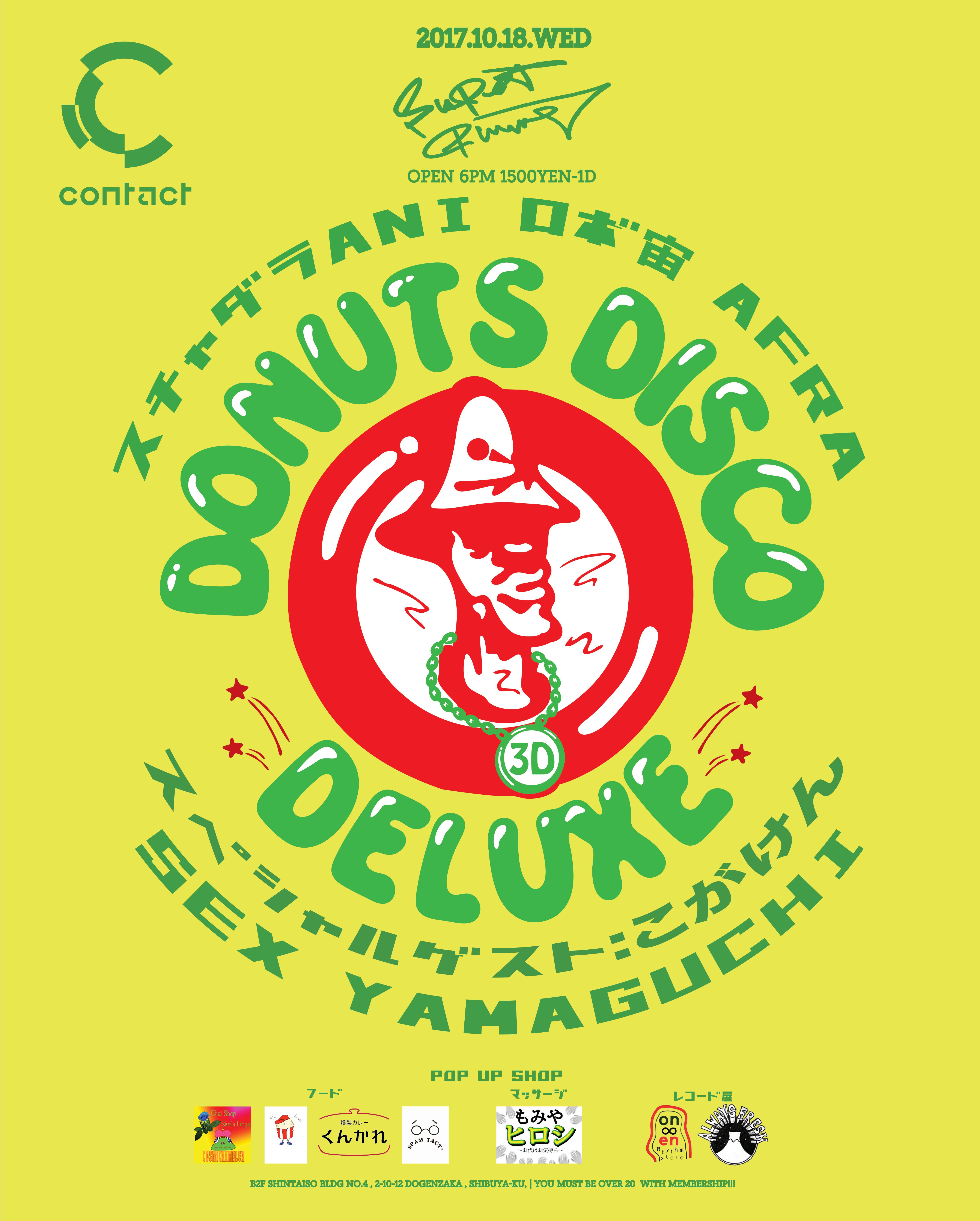 毎週水曜ブラックミュージックをメインにクロスオーバーなスタイルを提案するパーティSuper Plume。偶数月、第3水曜日を彩っているのがDonuts Disco Deluxe。スチャダラANI、ロボ宙、ヒューマンビートボクサーのAFRAからなるこのユニットは、70年代当時ゲットー地域ブロンクスで行われていた違法野外パーティ”ブロックパーティ”のライブ感や熱量を現代にアップデートしている。ヒップホップ、ソウル、ファンク、ディスコを軸に、DJ、MC、ヒューマンビートボクサーと3人3様の芸当を叩かみけるように繰り出すそのスタイルは、音楽やパーティ本来の楽しさを教えてくれると共に独自のパーティ感を作り出している。毎回Pop Upコーナーを設け、フードやレコード店、マッサージ店も並んでいる。さらに今回は、ゲスト DJとして”SEX Yamaguchi”とお笑いライブに”こがけん”が出演!Donuts Disco Deluxeが送るハッピーな一夜を是非!